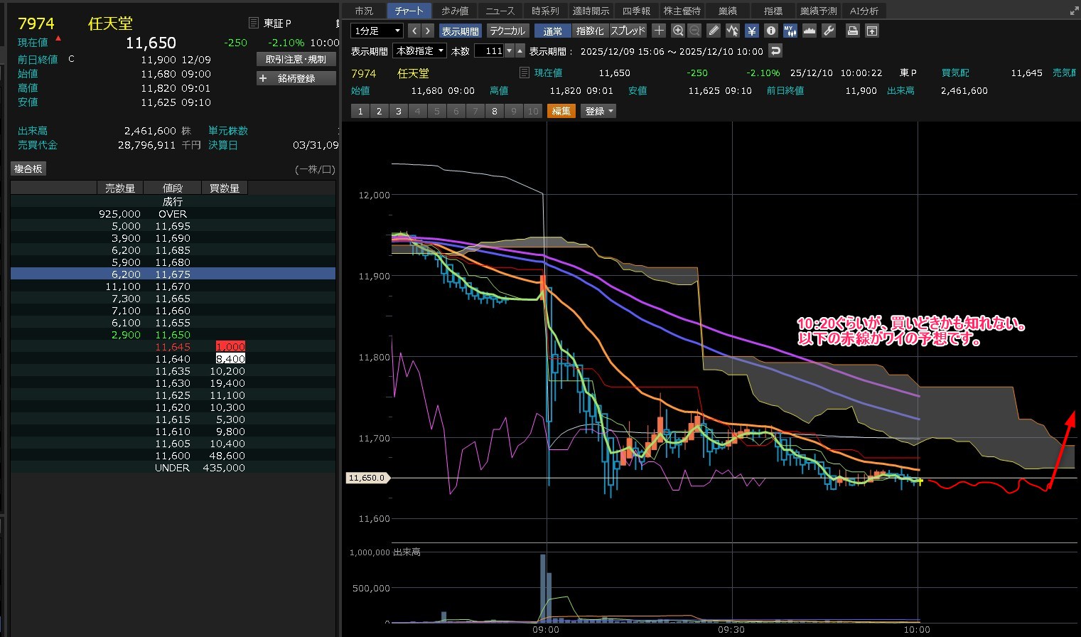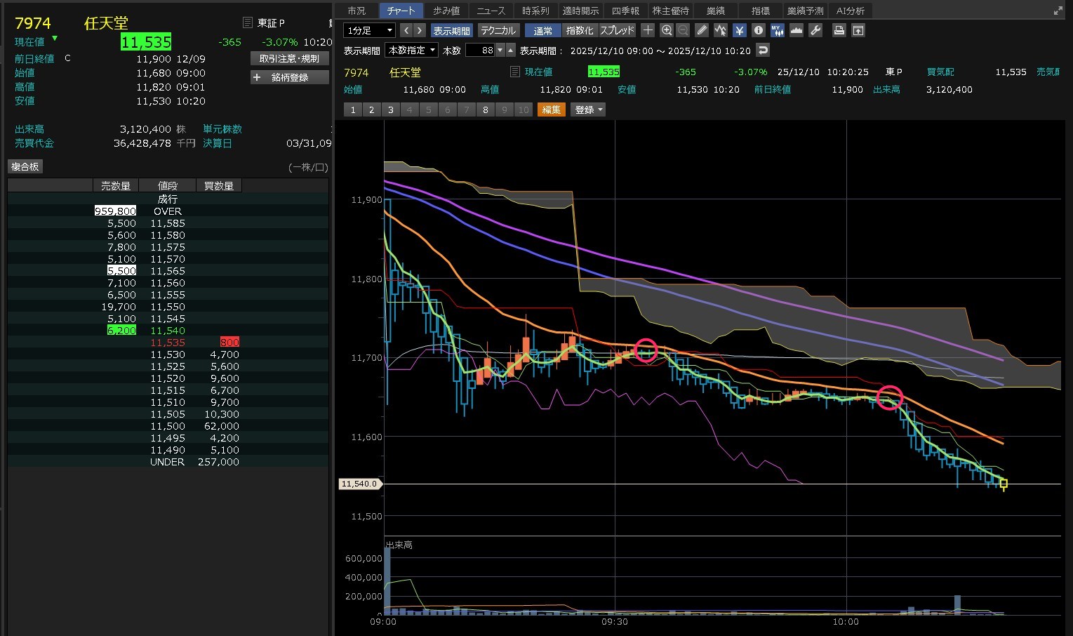 11550割り込んだ。20万株の投げきたよ・・・ただ、ココから上げて行くのとちゃうの?ってか上げろよ。ヒゲ無視したら四空やんけ・・・任天堂出来高もエグいな。今日まだ10:17やのに出来高300万株超えてるで!@11500割り込んだら追加購入かな。ってか、上昇を確認できてないから買えないわ。現在・・・@11540です。このまま板が厚い方へ行くから板を厚くするなよって思うんや。