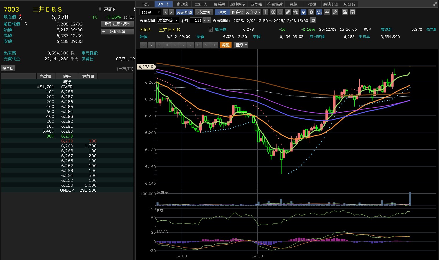 なんだかね。日経が上げてきてるのに全然反応しない。ただ、雲を抜けてオレンジの線を抜けて買いに転換しましたが、VWAPが1400あたりなんや。この水準だとね。なんだか買う気が起きないのよ。これなら三井ESを買っておけばよかったよ。現在@6200ですね。