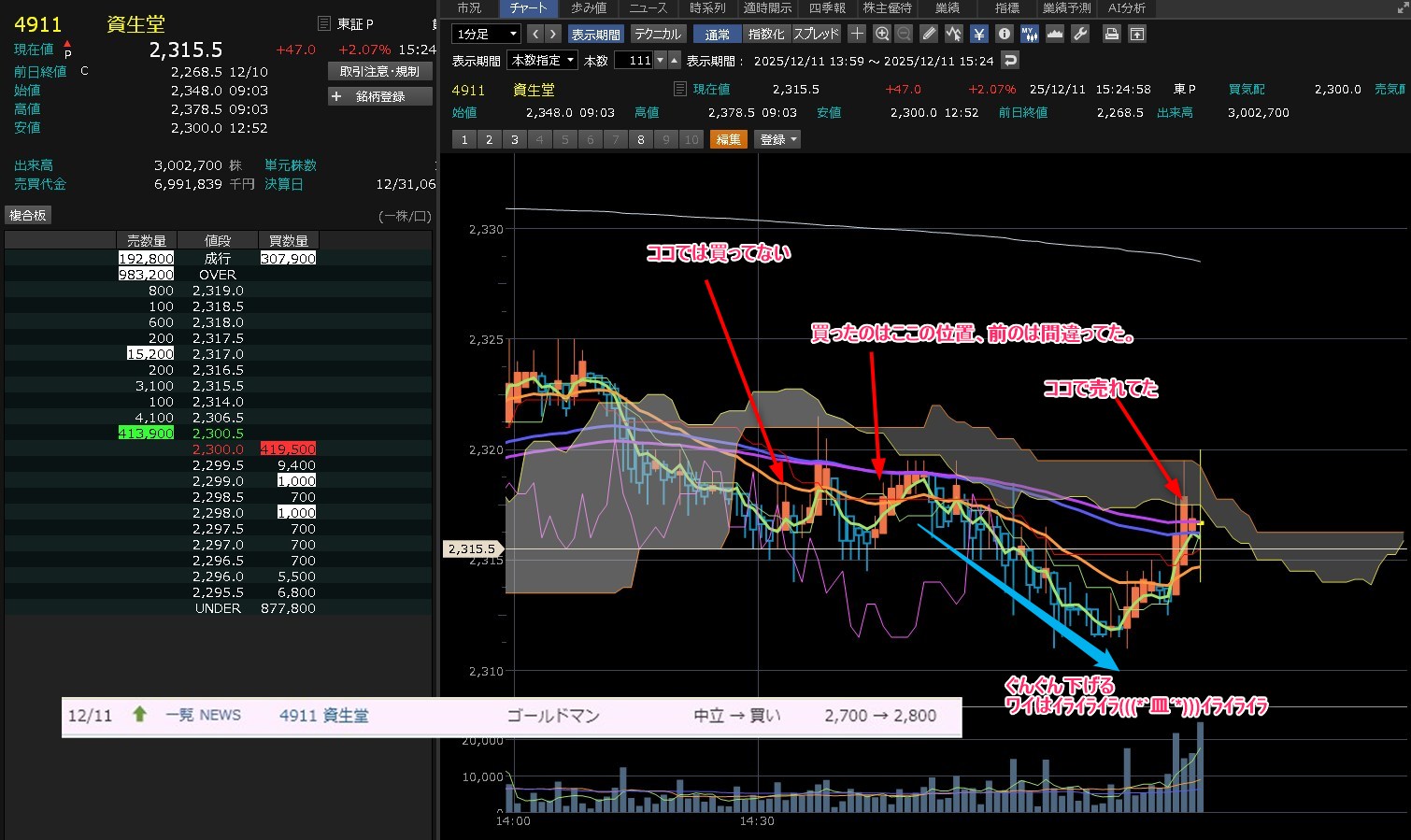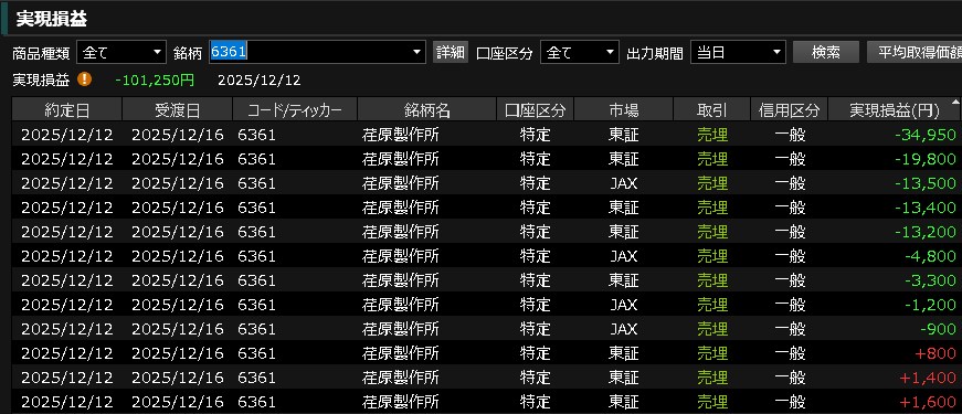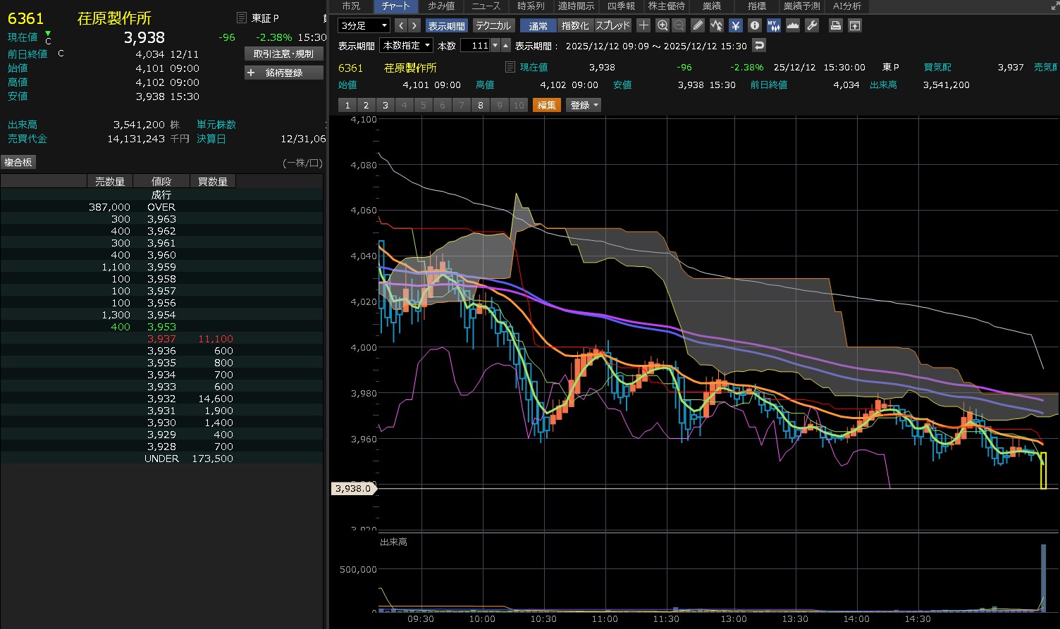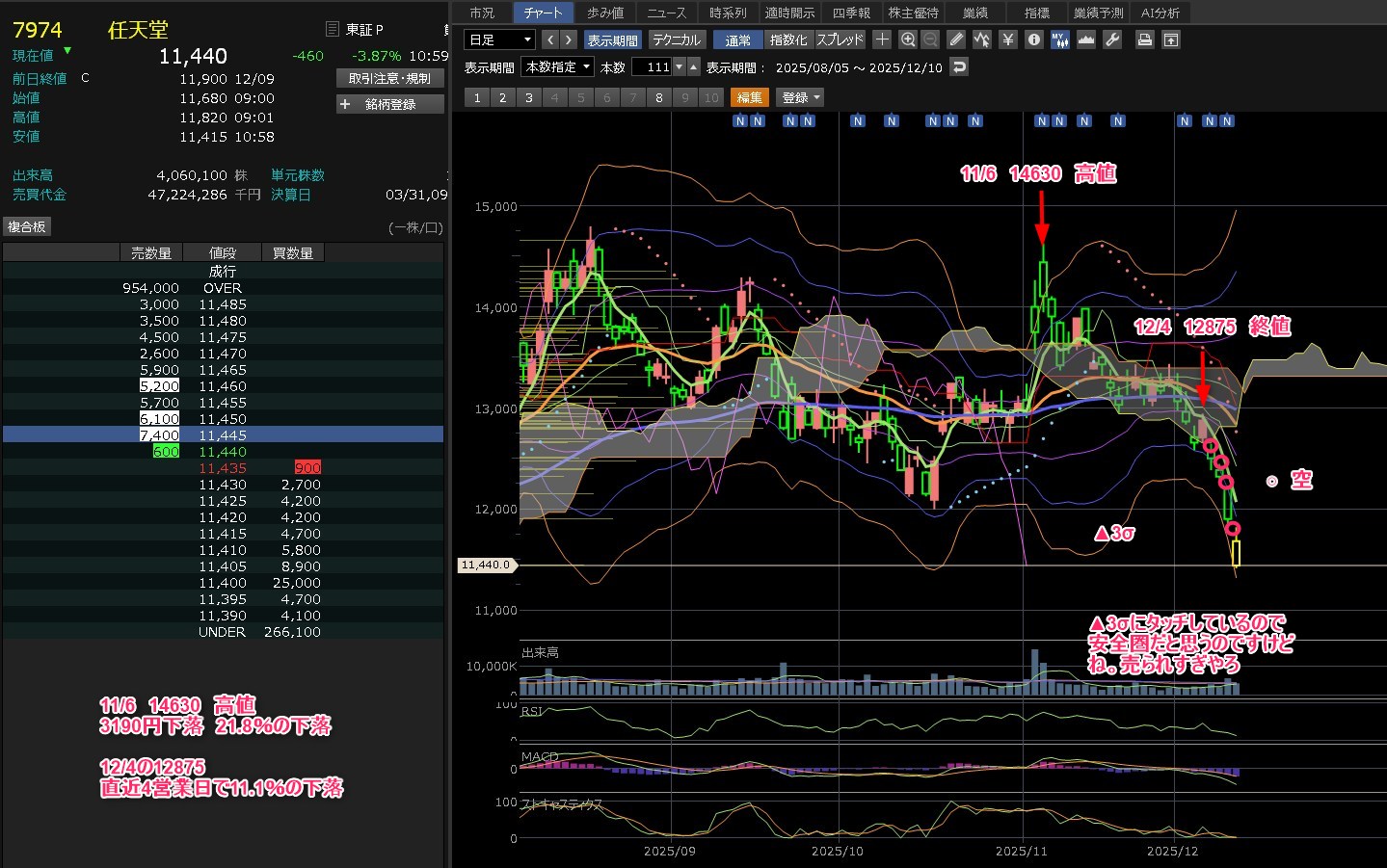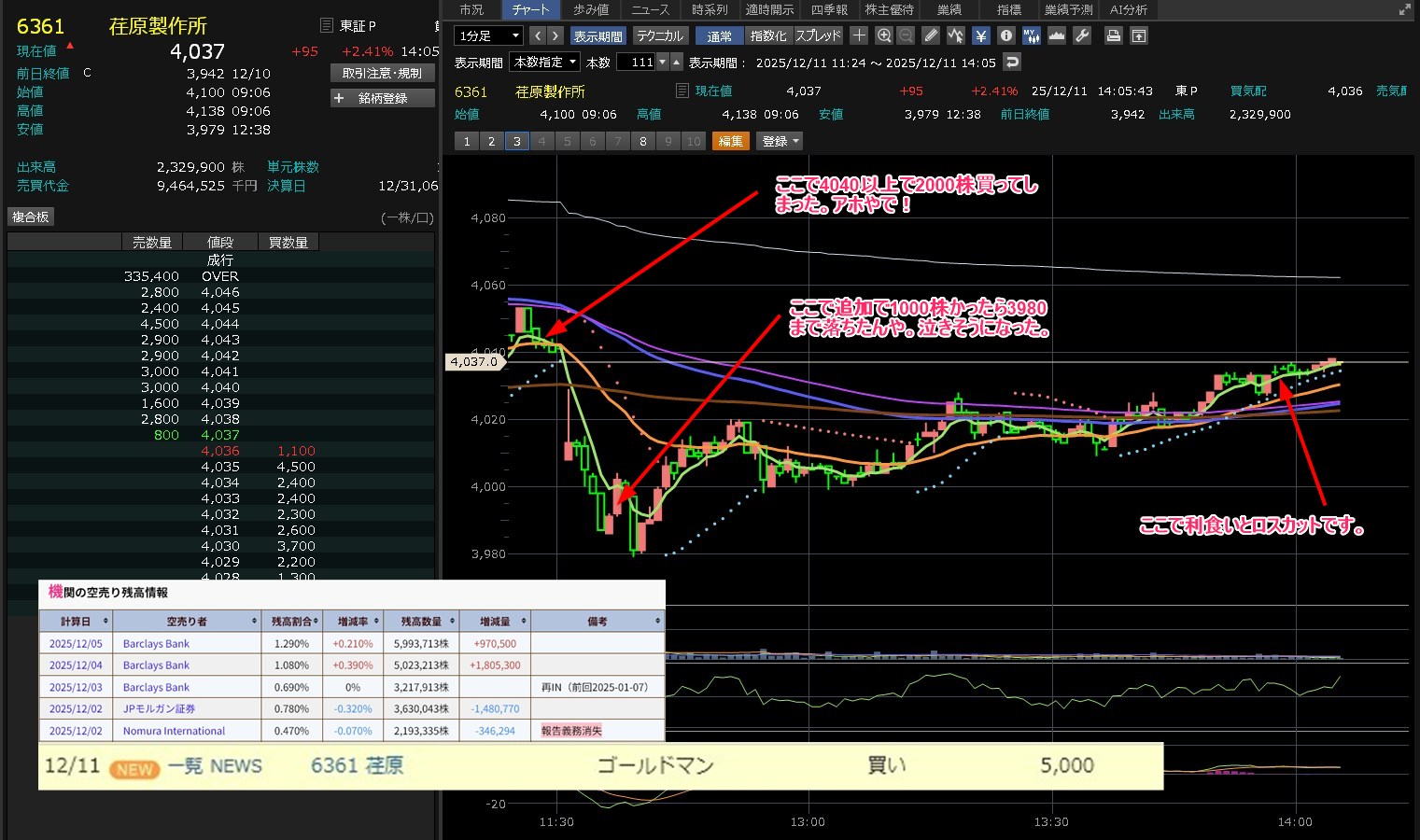 後場が始まりました。ギャップダウンのスタートです。ワイの持ち越し株は利益確定の売りが出て・・・含み損は膨らみました。ただ、前場より余力はある!昼寝でもするか・・・機関の仕掛け売にリーマンのボーナスがどう対抗するかやね。にしても値幅が850円ってどんなあれやねん。ワイの持ち越し株もギャップダウンで安値更新で・・・
