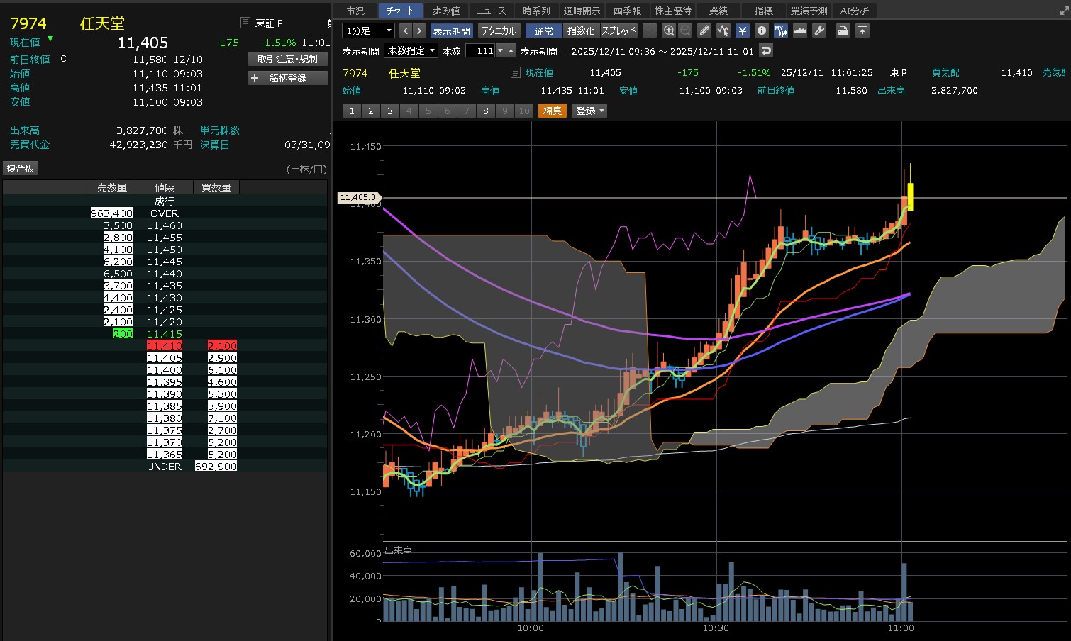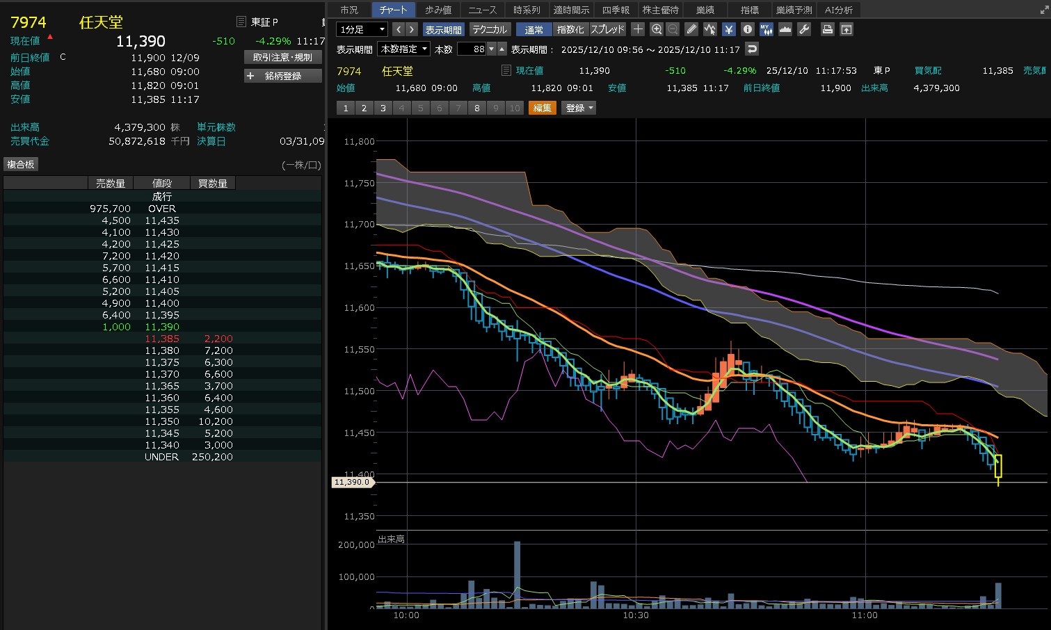 後場が始まりました。ぶっちゃけ余力があるからなにか買おうかなって考えたりしています。それにしても任天堂ひどいな。一旦、12000割り込みそうな予感がします。こういう厚い板は一度突き抜けるんやで!何度も見てきた。アルゴっちゅうやつや。