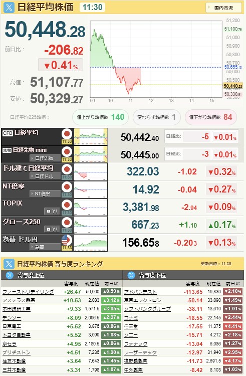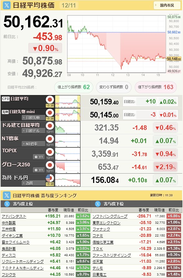 日経平均50,148.82-453.98-0.9%[15:30]米ドル/円156.09+0.08+0.05%[15:29]