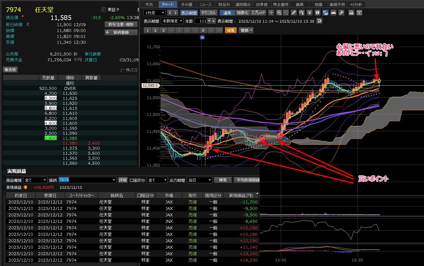 本日のデイトレ結果と日経平均の1分足は以下のとおりです。 とりあえず、朝方上げて、乗れなかったってことで初押しで購入したら任天堂はどんどん落ちていった。落ちるナイフを4回掴んでなんとかプラスで逃げれました。ホンマにホンマに叫びたくなるような1日でした。ワイもまだまだちっさい。