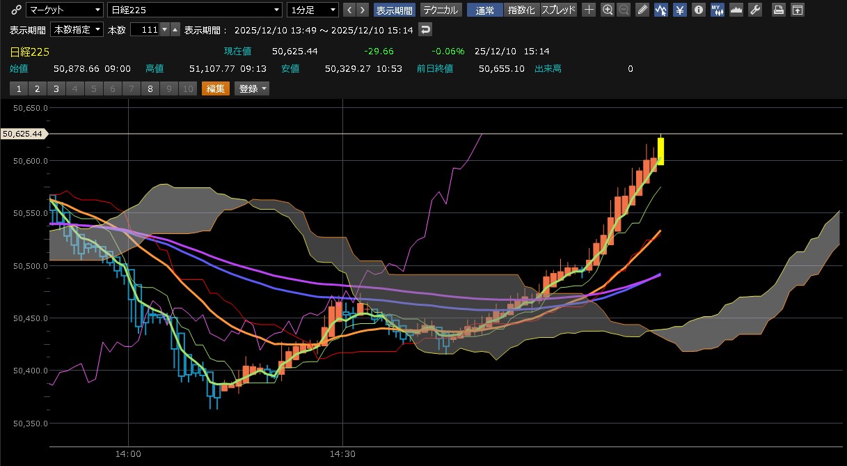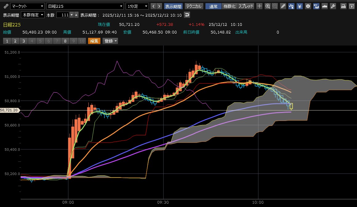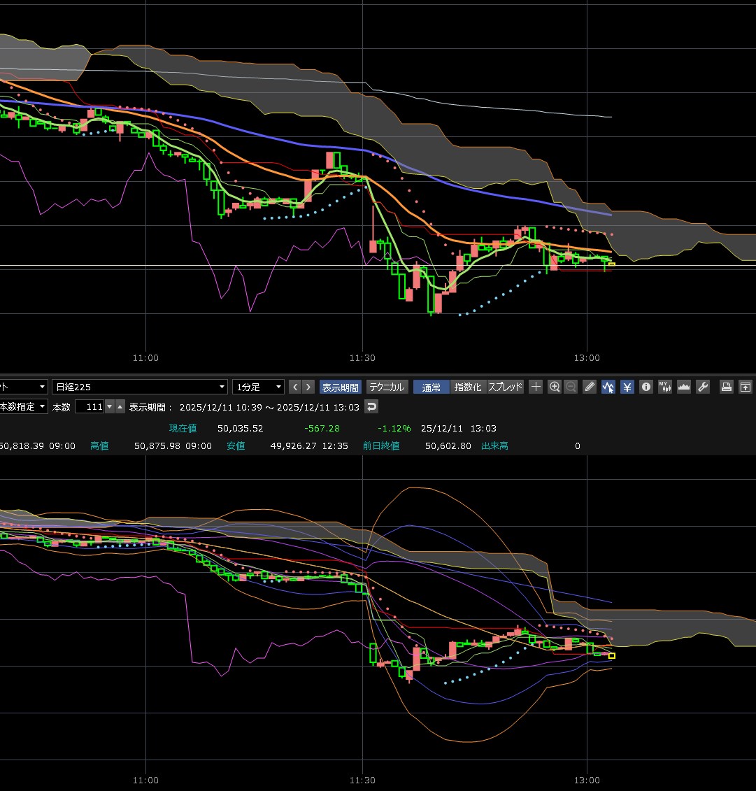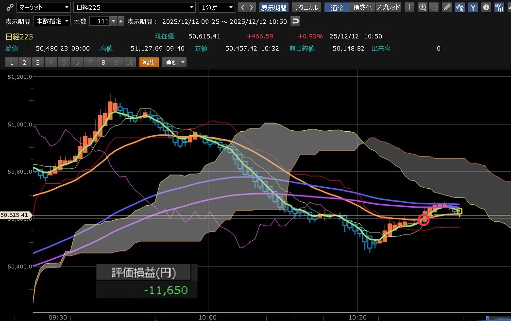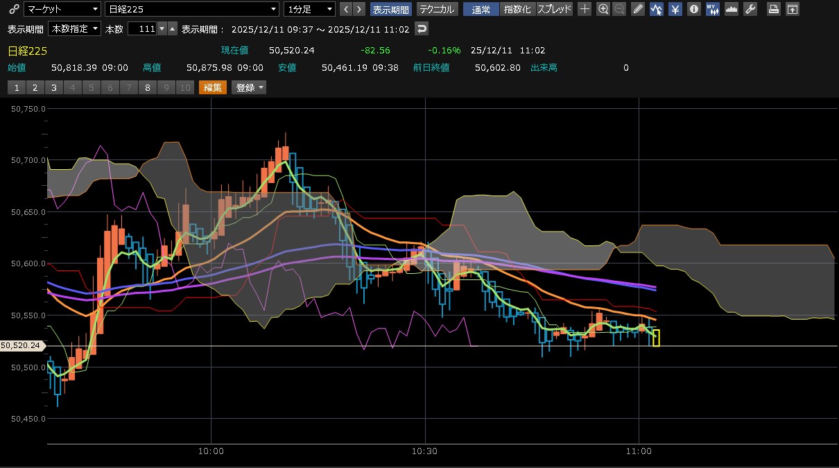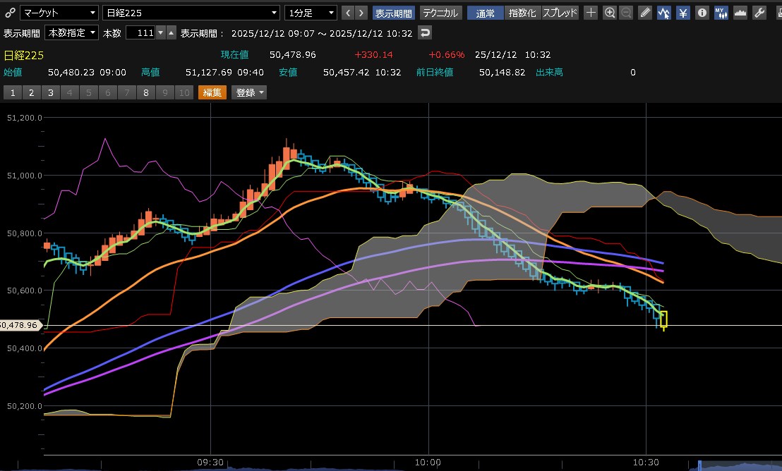 SQ値は50536ですね。現在SQ値は上回って日経は推移しています。通常はSQ値よりも上で引けると上昇基調になるんですけど・・・最近は当てにならない。前場乙でした。