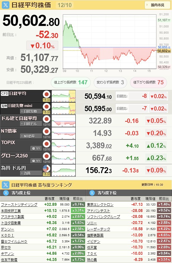 日経平均50,602.8-52.3-0.1%[15:30]米ドル/円156.73-0.13-0.08%[15:30]