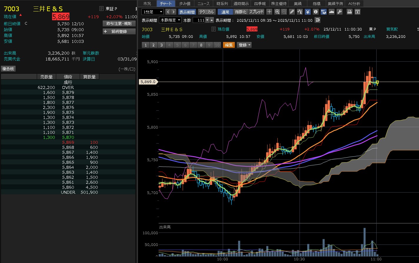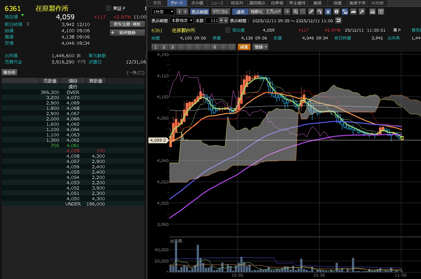 マキタ強いな。三菱重工強いな。日本製鋼所も強いな。ちょっと買えないわ。チャート見てるといま、アドバンは買えるけど、エレクは怖いな。VWAPがうえすぎるんや。含み損抱えたやつおおいっしょ。なんか後場飛びそうやな。何か買っとくかな。知らんけど・・・