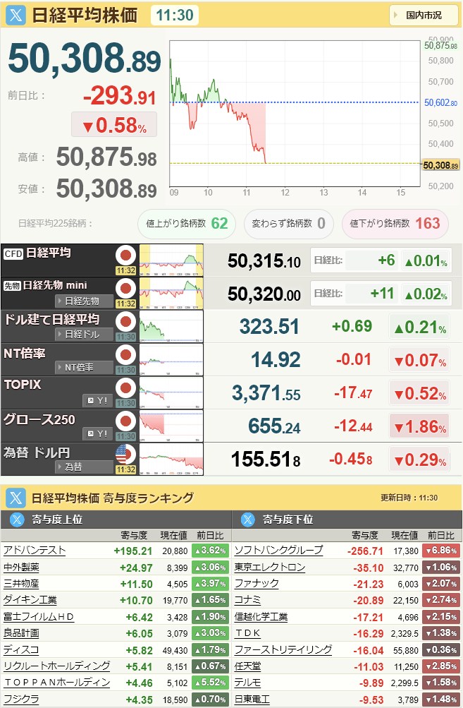日経平均50,581.94+90.07+0.18%[15:30]米ドル/円155.17-0.12-0.08%[15:40]