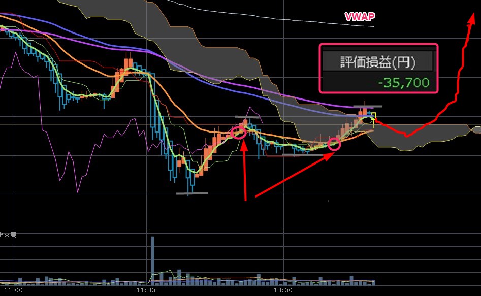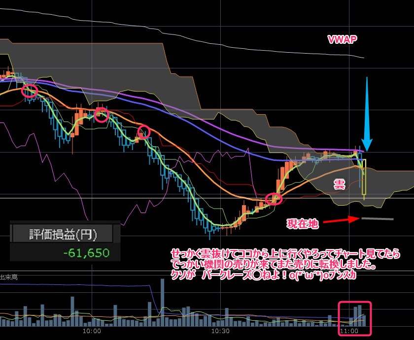せっかく上げてたのに・・・ホンマにクソやわ。何このまとまった売り・・・殺意しかわかないわ。ってかホンマに・・・後ちょっとでプラ転ってところでこんな一気下げは無いわ。ふつうさ・・・このチャート見て11:00頃やったら上に行くと思うやん。ところがや・・・ところがや・・・機関は簡単に流れをかえるんや。このチャートで懸念事項はVWAPがうえにあるっていうこと以外はワイにとっては最高の買いやったんや。11時に「上がるぞ」って嬉々として資料作ってたら下げてるもんやから作り直しや。雲した抜けてるし・・・ほんま頼むわ。_| ̄|○))頼む!お願い!この通り!11:11