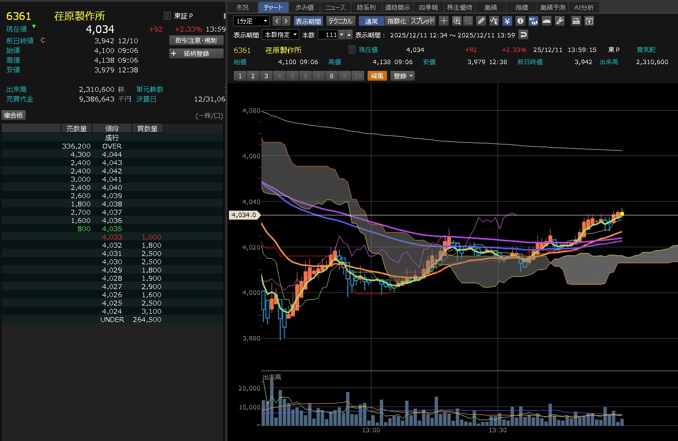 荏原製作所上げてきたな。@4039やで!引けには@4050はいってるとおもう。でももう心臓に悪いから売ったんや。多分引け間際にゴールドマンの意地が見れると思う。うえに行くっていうことや。