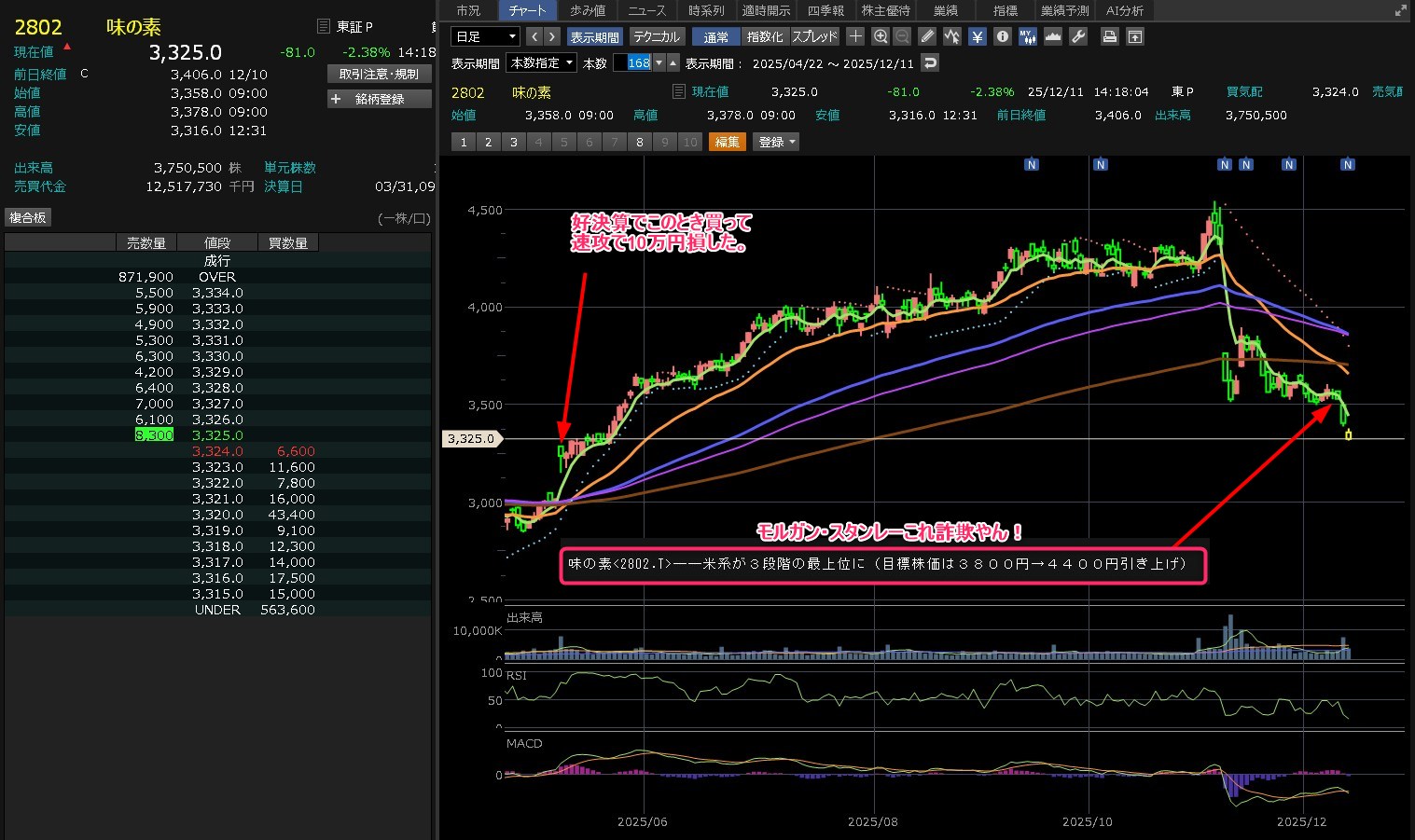 味の素厳しいな。ロスカットして大正解やったわ。ホンマに危なかった2000株。今週の火曜日の出来事・・・ちなみに2025.5.9の取引は以下を参照。