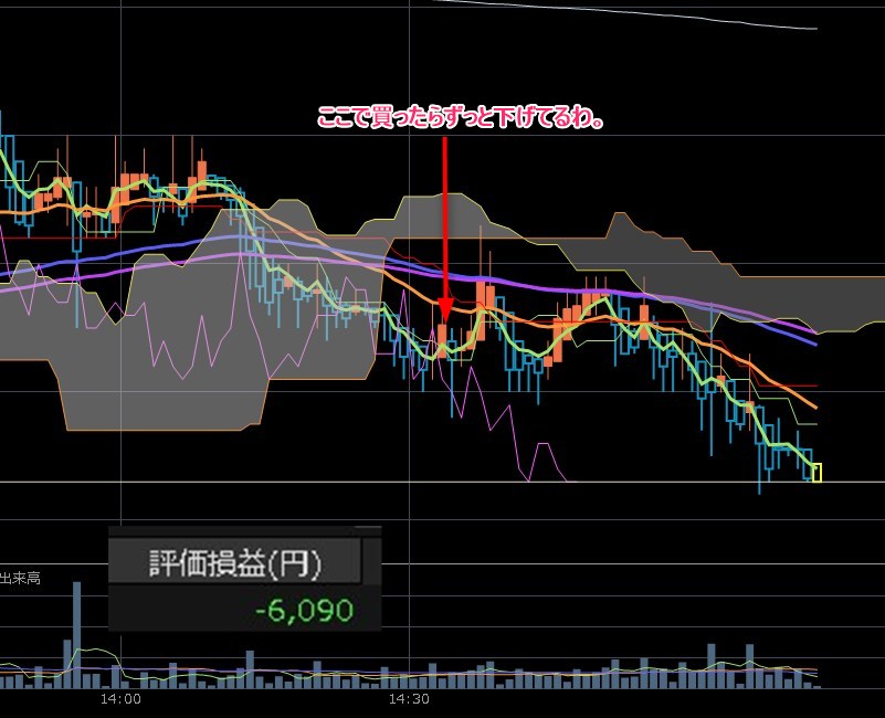 ちくしょーまた買ったら含み損になってしまったわ。日経が下げに転換したらワイは買ってしまってホンマにアホやで現在2万円の含み損です。ちくしょー