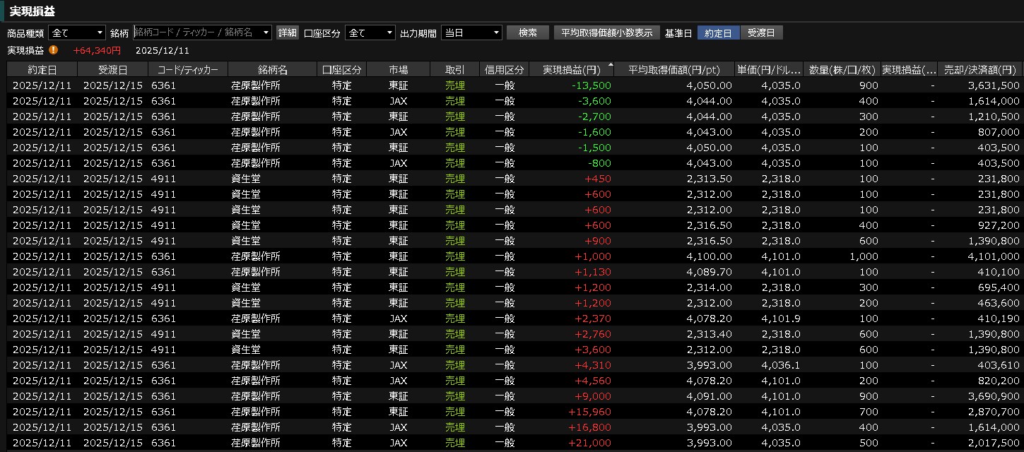 本日も終わりました。今日の日経は予想通り引けドンでしたね。資生堂は闇鍋しても実は儲かってました。買い下がって2315@3000でしたからね。実際は@2318で売れてましたからね。本日の取引は以下の通り・・・