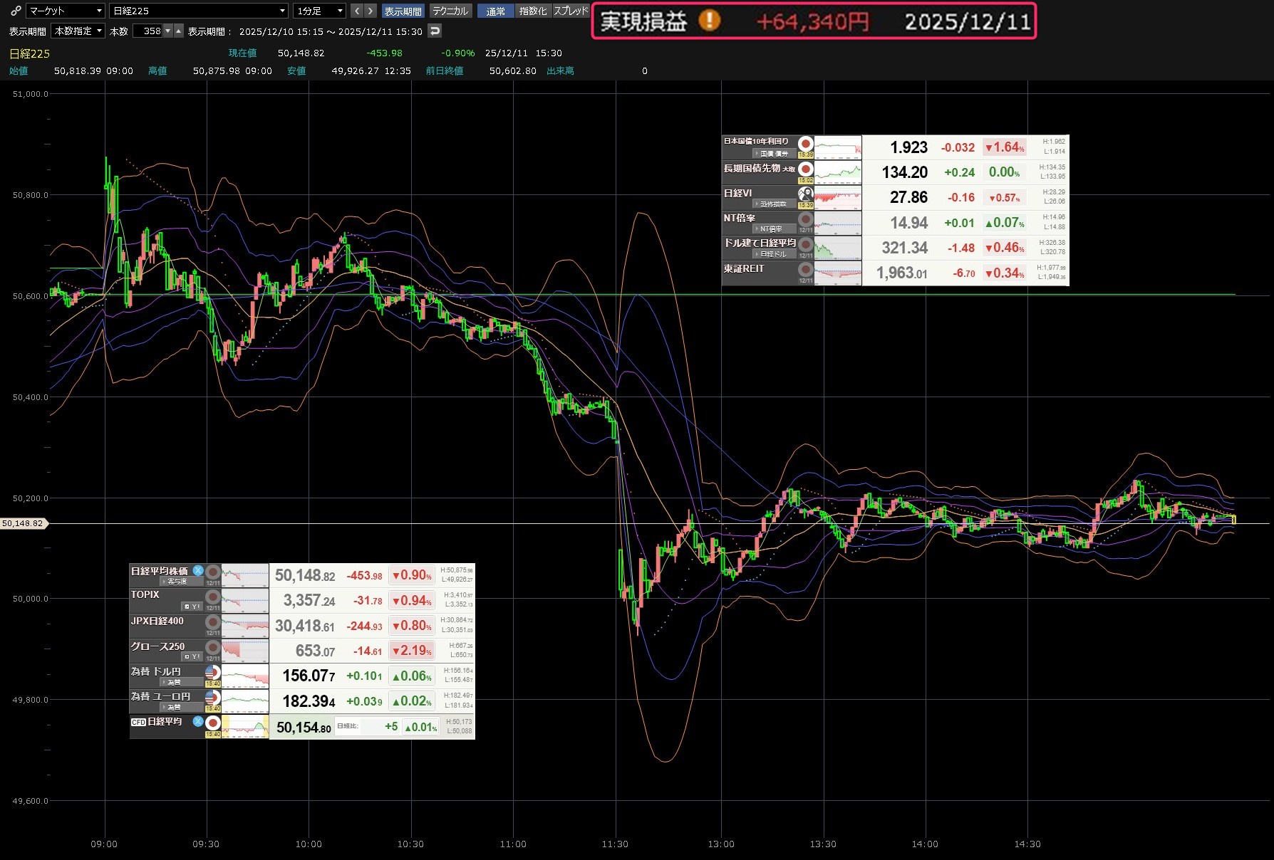 本日のデイトレ結果と日経平均の1分足は以下のとおりです。 このチャートで勝てないワイは大いに反省すべきです。ホンマにアホでした。学べよって感じですね。経験は積んだ・・・痛みとともにね。だからこそ糧になってるはずや。マイナス5万円は痛いよ。ちょっと寄り付きで14000儲けて、これを損したくないとか思ってしまってロスカットが遅れたわ。ホンマにアホやわ。ワイの精神状態。そういうのは気にするなって・・・取引が終わったらリセットしないと・・・ホンマにそうやわ。