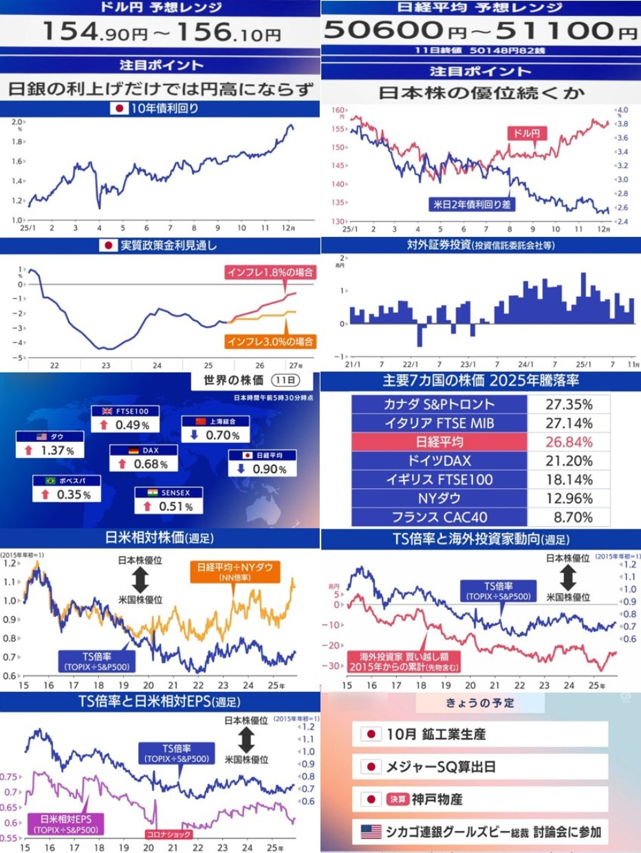 何と言ってもアメリカの金融政策とメジャーSQですね。利下げが織り込み済みですが、ここでパウエルがどう動くかですね。メジャーSQでいろいろ動きそうっすね。持ち越しは怖いわ。なんて思いながら、今週末の日経平均・為替のプロに寄る予想は以下の通りです。 いつも高い予想をするのは東野さんやったんやね。そして悲観的な予想をするのが、浪岡さんか・・・こういうのはわかってええよね。両極端は大好きやで!ワイは無難に「50000@153」とします。