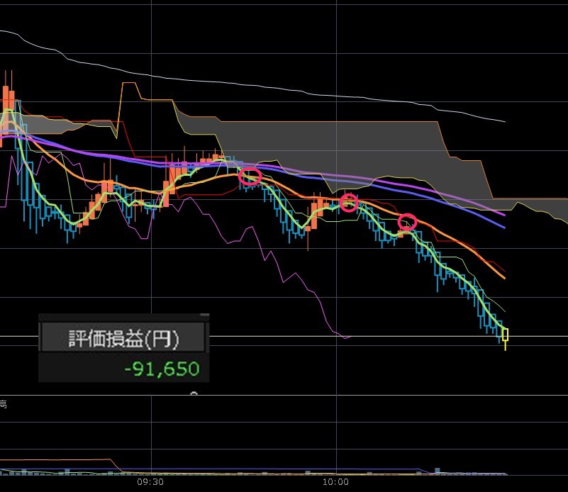 買い物から返ってきました。そしてすぐにとある銘柄を買うといきなりズドン・・・そんな気はしてた・・・本当にそんな気はしてた。ただ、ココから頑張れや。追加購入は現在怖くてできない・・・そんな下げです。