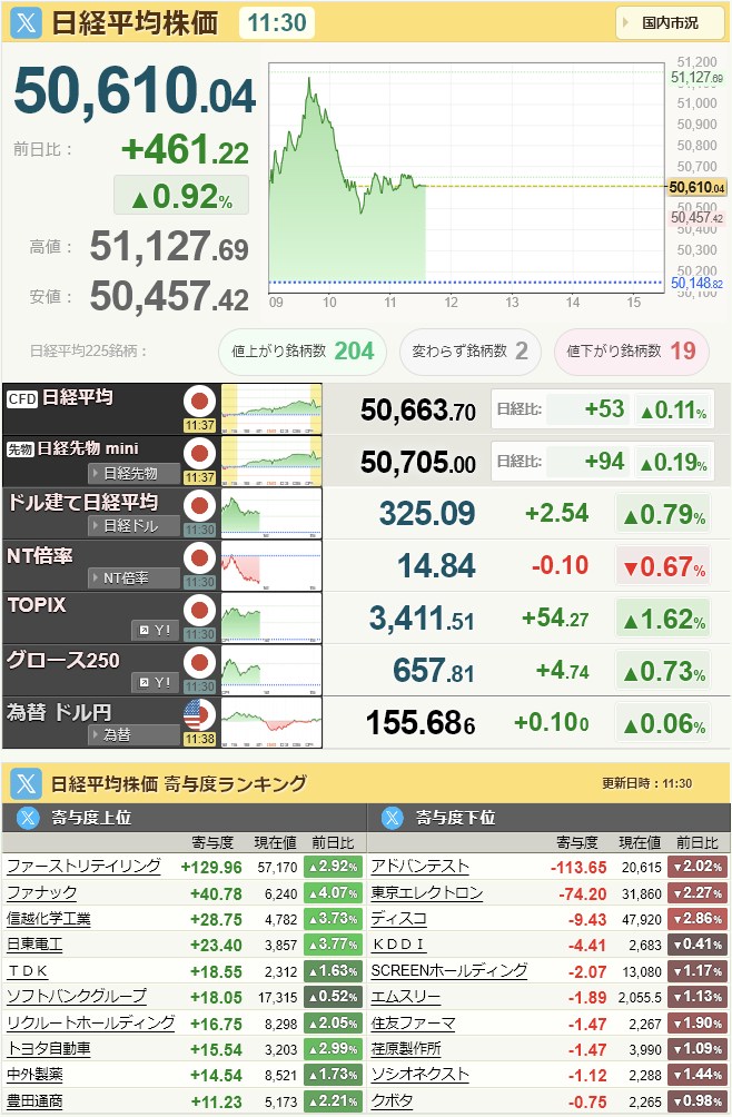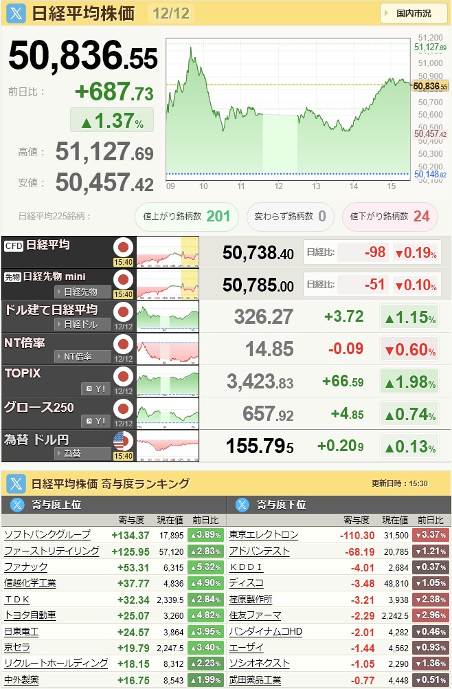 日経平均50,836.55+687.73+1.37%[15:30]米ドル/円155.79+0.22+0.14%[15:40]