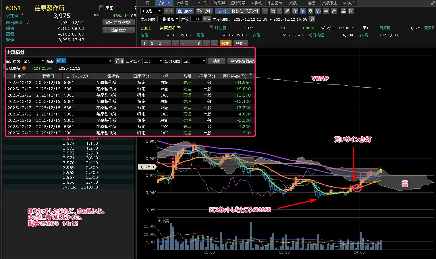 さて、前場が終わりました。売りはドスンと出るね。これロスカットの売りやと思うねん。買いは大きな買いがない。VWAPが超えないと厳しいな。ワイのようなレーティング見て買いに参加した奴が多すぎるねん。