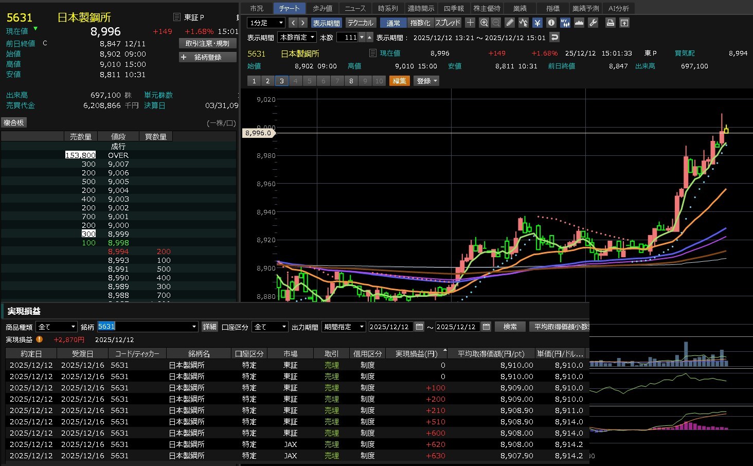午前中はちょっと日本製鋼所が残念やったんやな。買おうか迷ったけど買わんかった。ここはいやらしい売り機関が入ってるから午後から弱いかも知れへんからね。相性も合わないしね。でもポストプライムの会員じゃなくなったからワイの運気も開けてきたかもしれん。