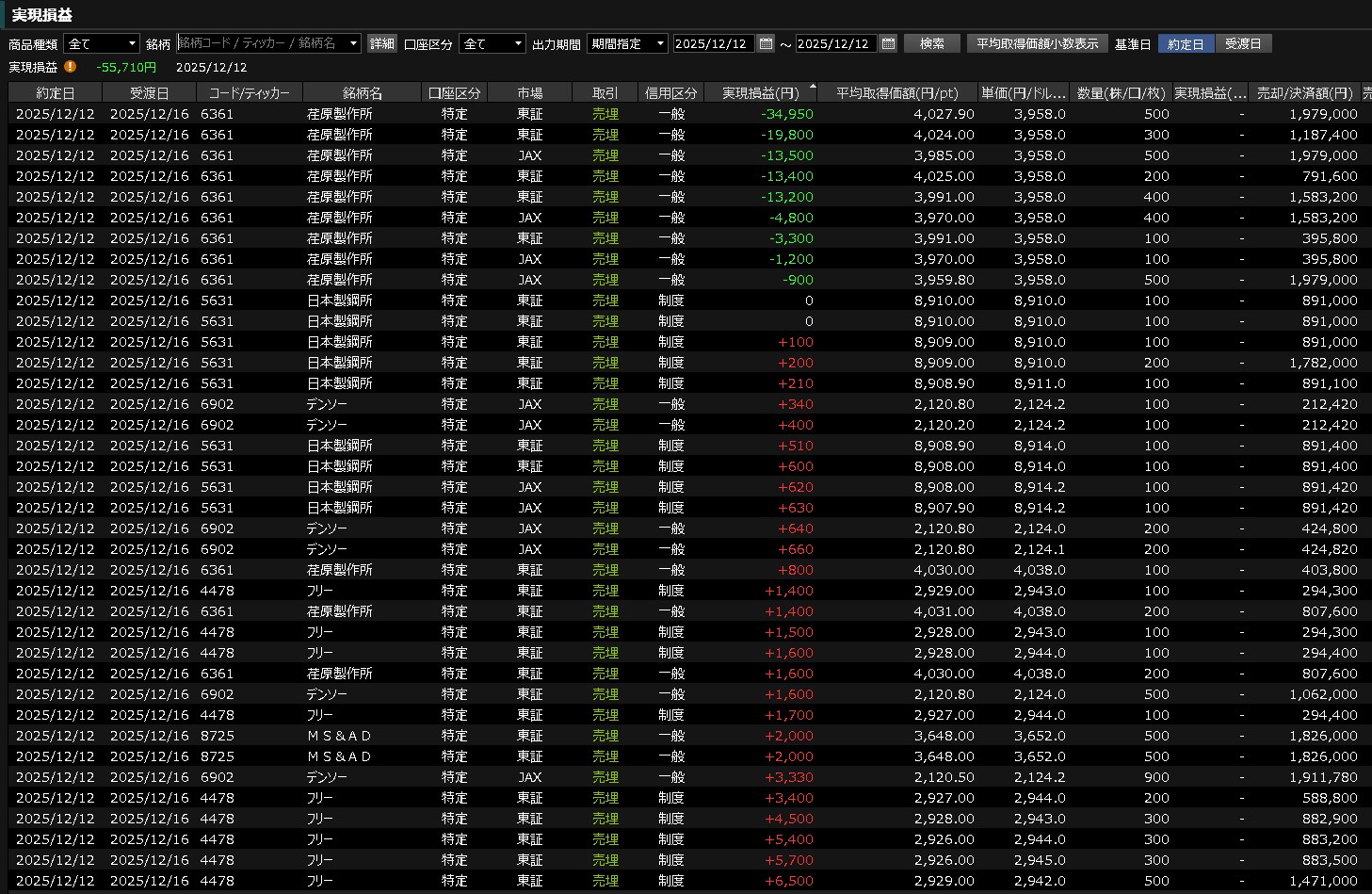 荏原はホンマにクソでした。いや・・・クソなのはバークレーズ・・・荏原はまた落ち着いたら入りたいと思ってます。12月決算やったんやね。親の口座で配当とっても良いかなと思ってます。12月は難しいな。損益通算とかあるからね。ワイは関係ないけど・・・(;д;)グスン 損してるからね (;д;)グスン SQ値よりも高く終わりましたね。これは強気で良いのではないかなって思ってます。乙でした。来週も相場を楽しみます。