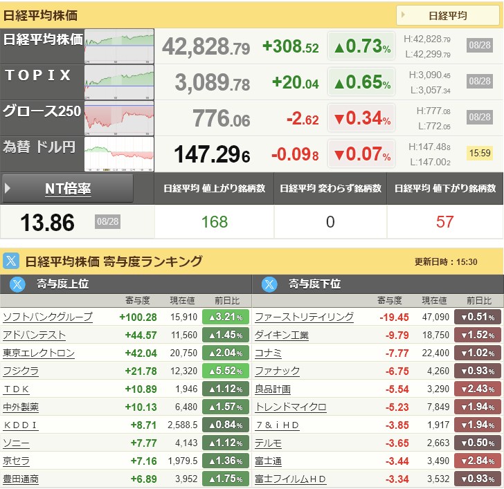 日経平均42,828.79+308.52+0.73%[15:45]米ドル/円147.29-0.09-0.06%[15:50]