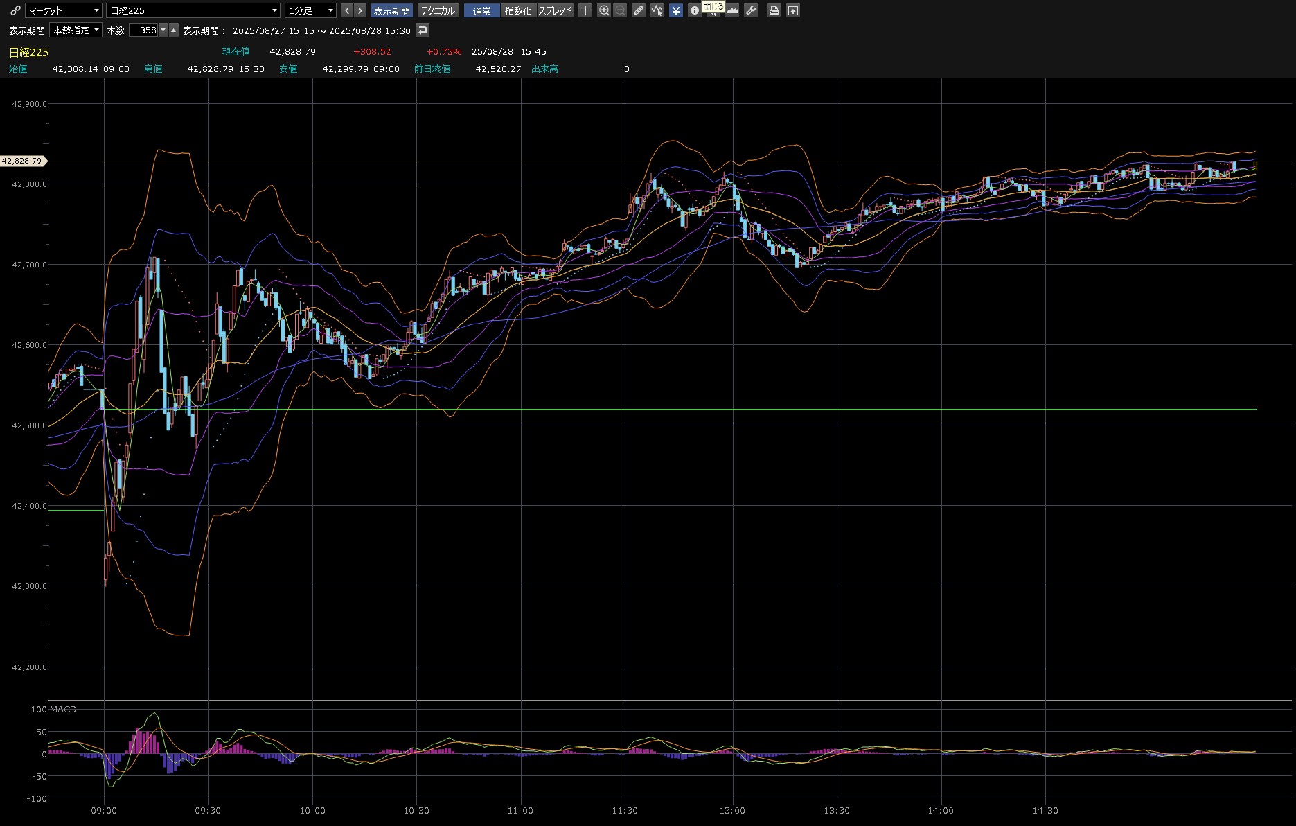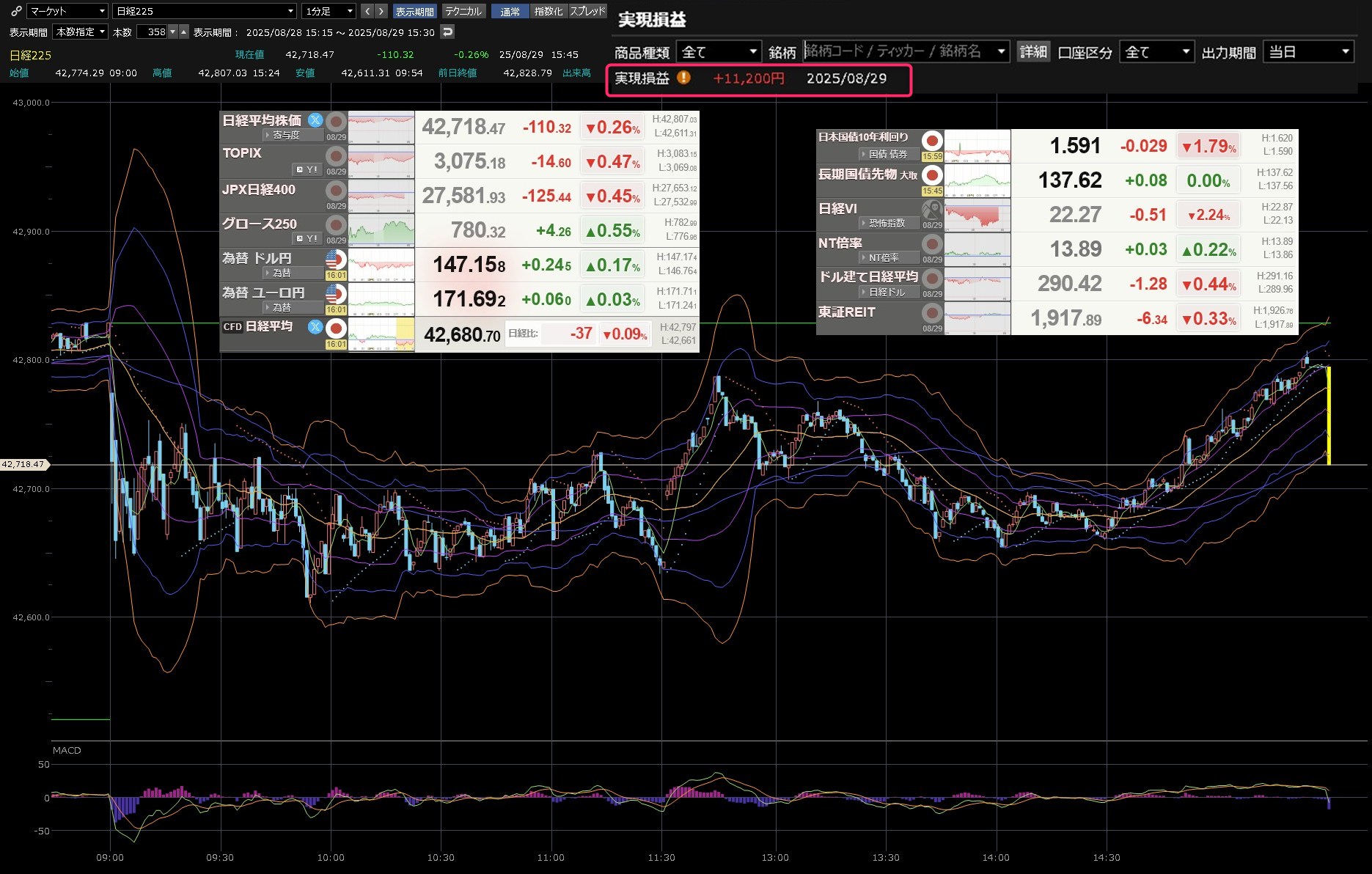 本日のデイトレ結果と日経平均の1分足は以下のとおりです。