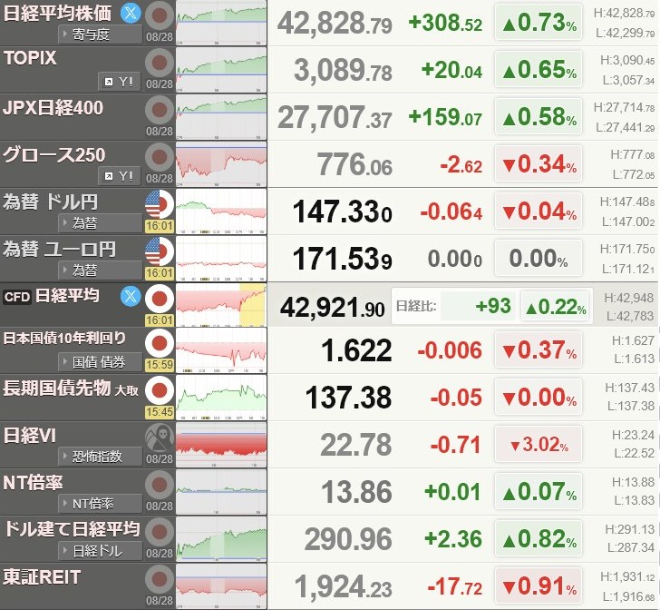 日経平均42,807.82+174.53+0.41%[15:30]米ドル/円147.2+0.31+0.21%[15:40]