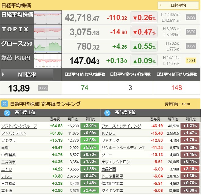 日経平均42,718.47-110.32-0.26%[15:30]米ドル/円147.01+0.09+0.06%[15:29]