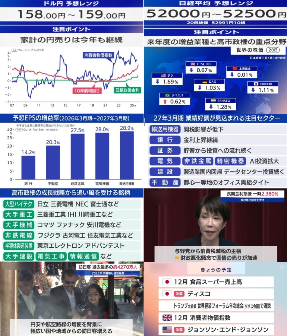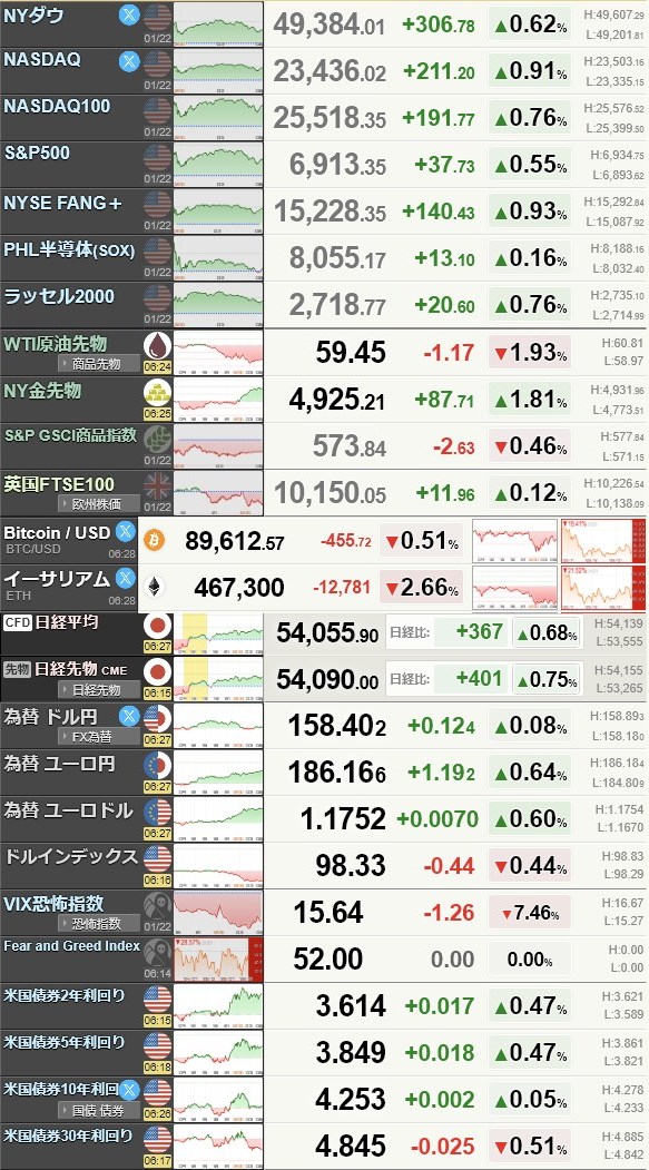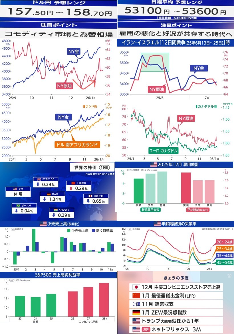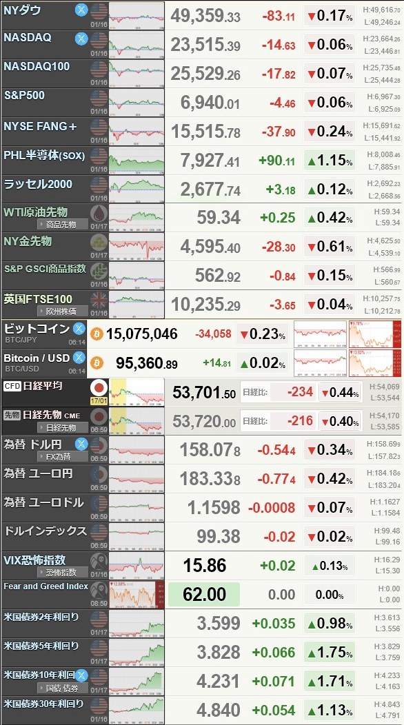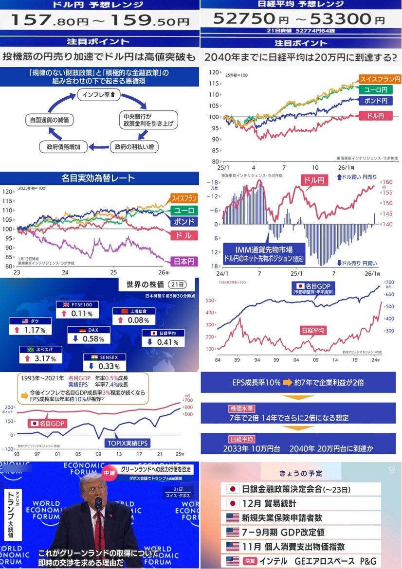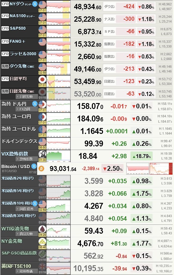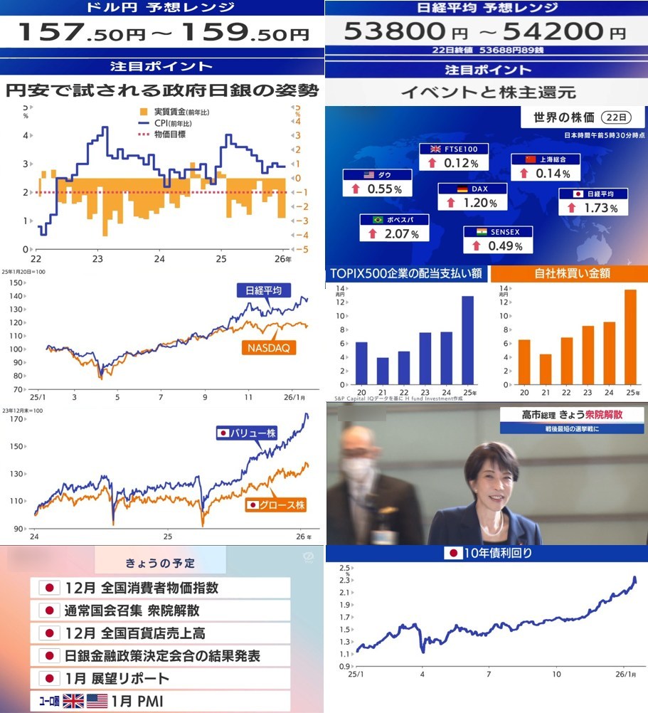日本でも高市内閣が衆議院解散を1/23通常国会開始日にする旨発表しました。いろいろ時代は動くなと思いつつ、米市場の結果と本日のレンジ・予定は以下のとおりです。