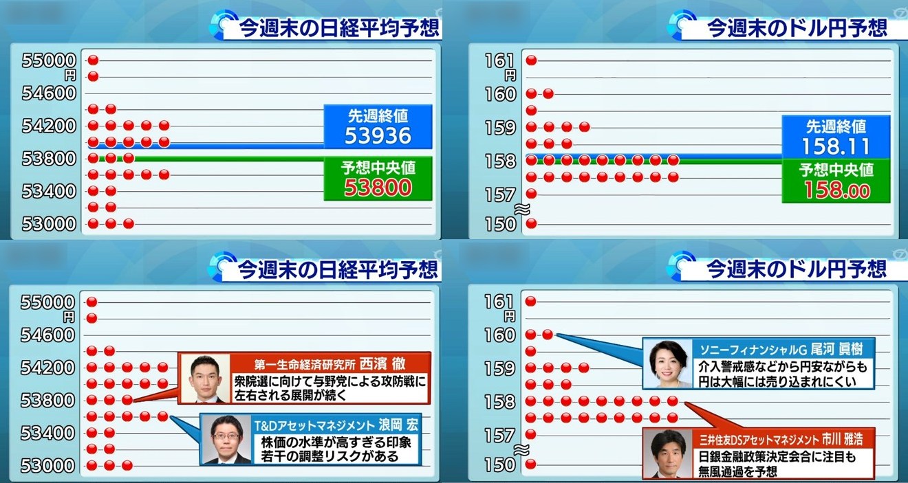 今週末の日経平均・為替のプロに寄る予想は以下の通りです。 ワイの予想は「54000@157」とするで!日経の報道で為替はあんまり動かないと思ってる。選挙で高市さんがボロ勝ちすれば一瞬円安に進んで政権が強くなったことにより円高になると思ってる。安倍さんのときもそうやったやん。