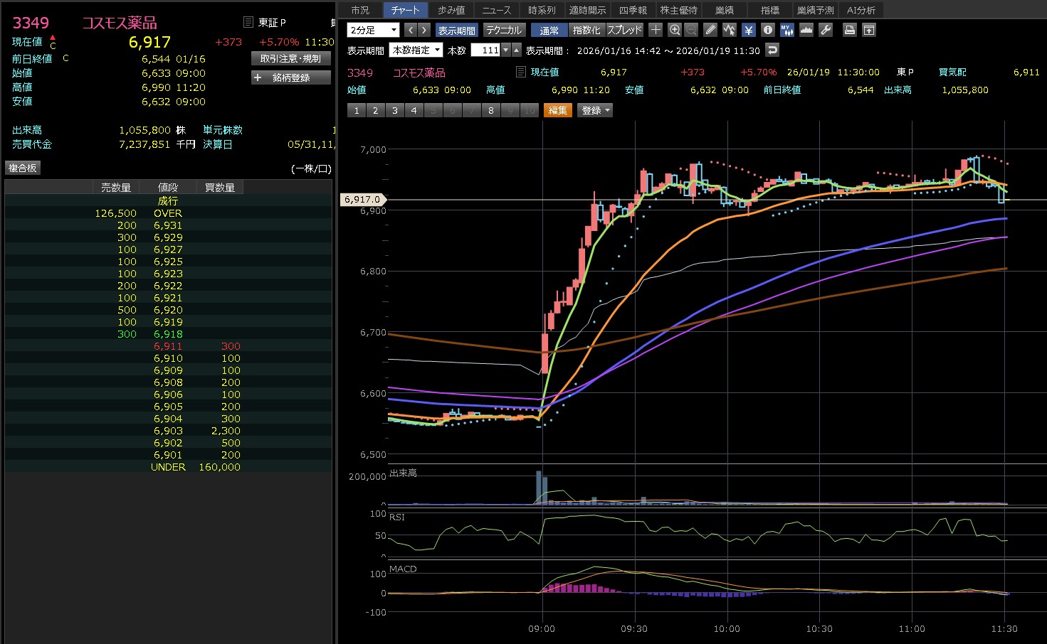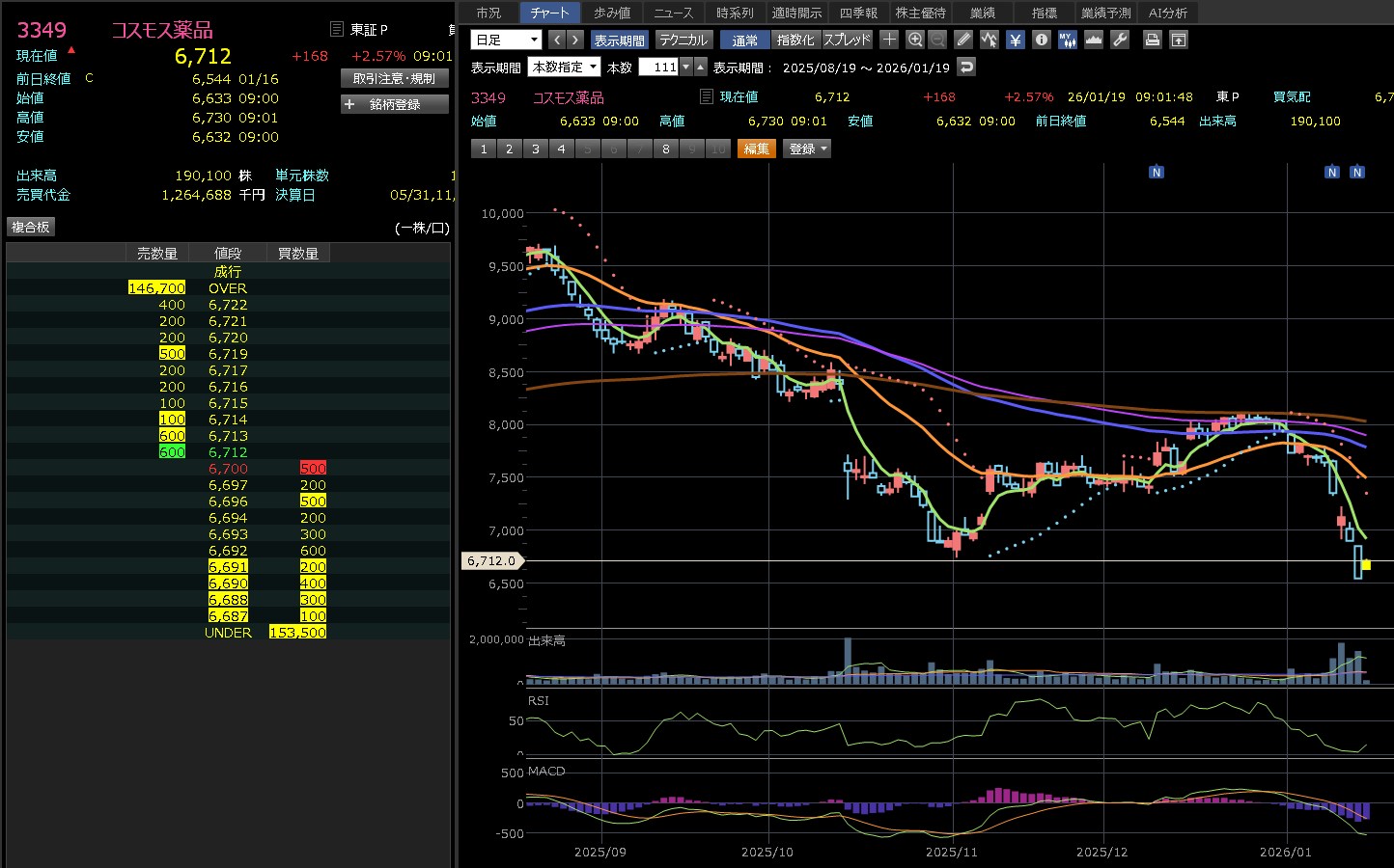 ちょっとこれは悔しいな。コスモス・・・ワイがロスカットしたラインから100円上げてるやんけ・・・このまま7000超えたらホンマに目も当てられん。仕方がないことやけどね。大和のレーティングがホンマに余計やったわ。いつものコスモスが帰ってきた。まぁワイがロスカットしたからやね。@6900超えとるわ。
