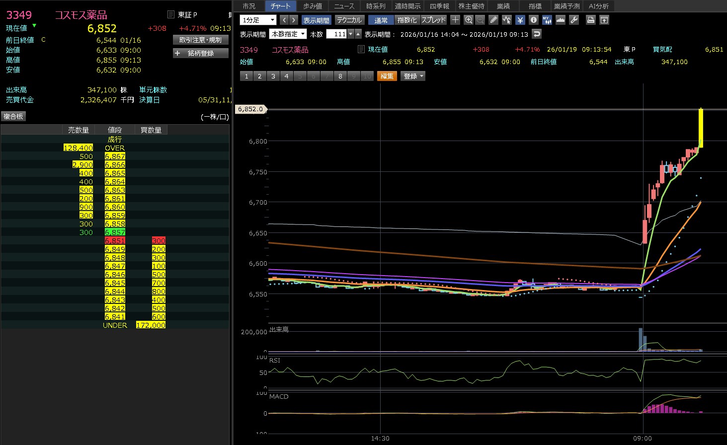 前場が始まりました。予想通りコスモス上げてますね。もう買わんけどね。そんな気はした・・・流石にね。もう少し上手く乗らないとってことで色々学びましたよ。