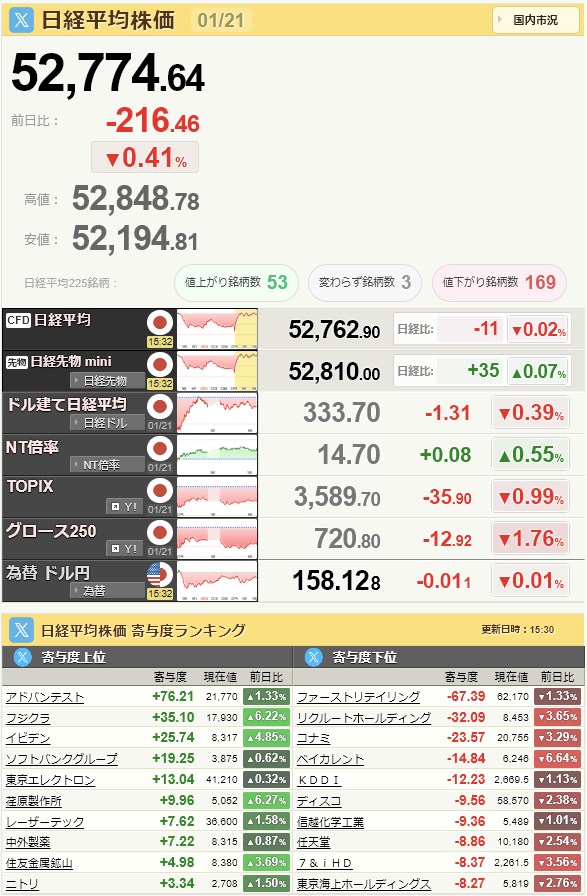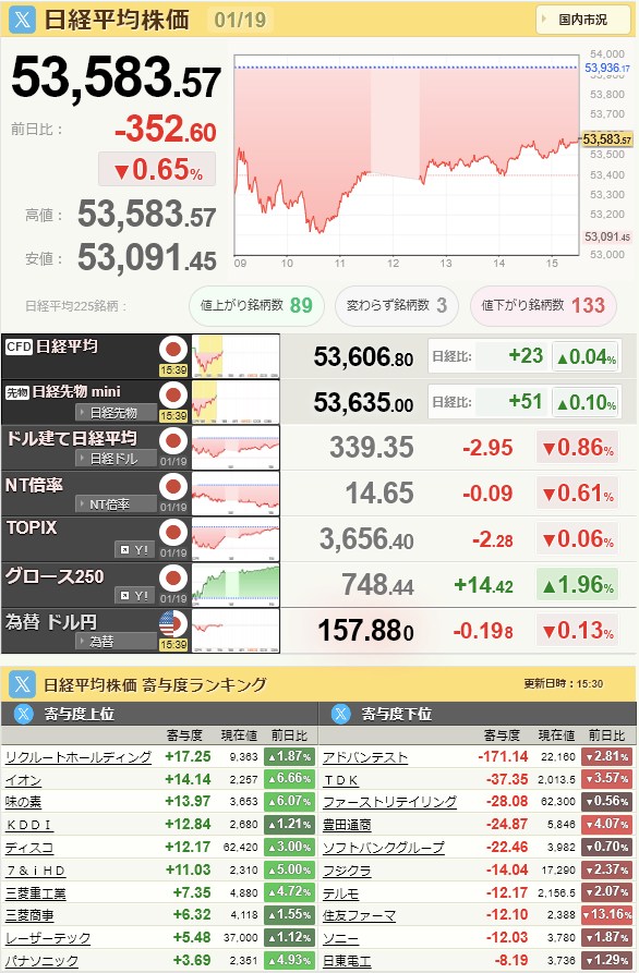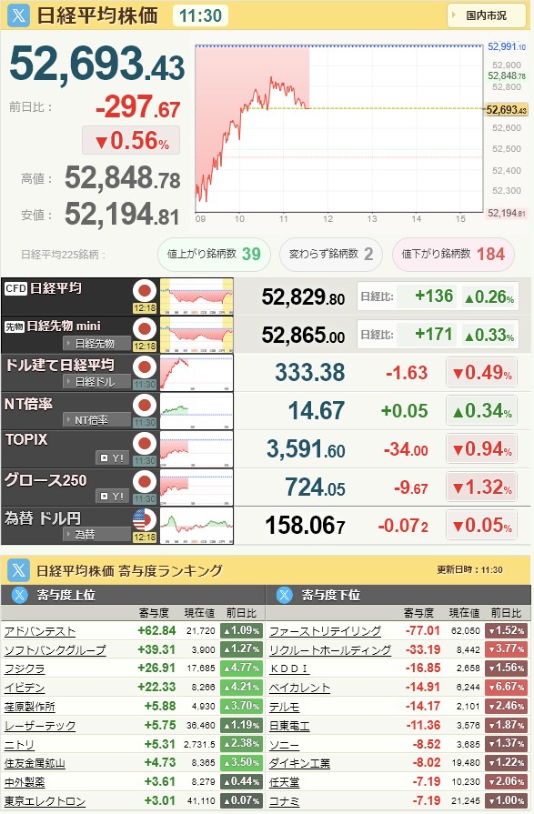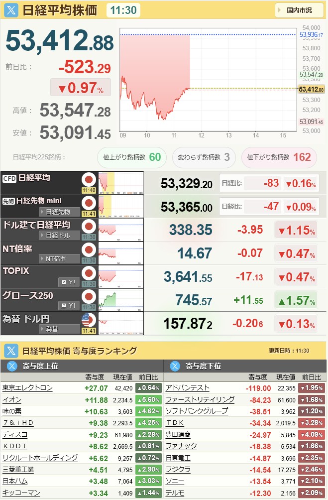 日経平均53,583.57-352.6-0.65%[15:30]米ドル/円157.88-0.19-0.12%[15:39]