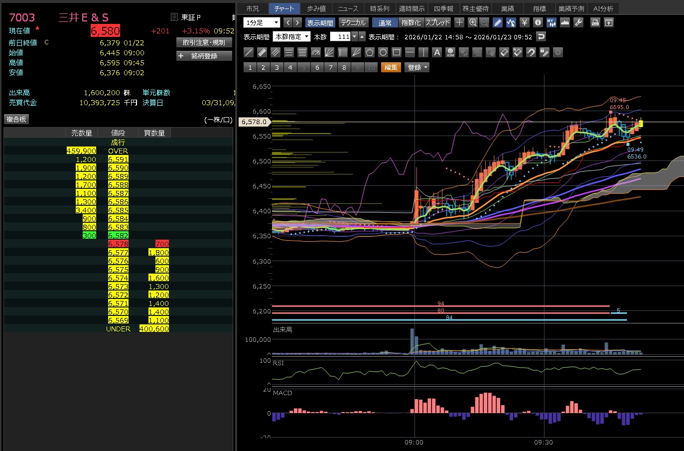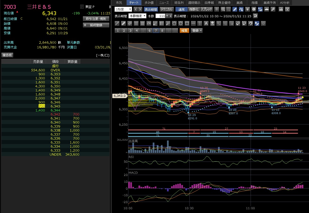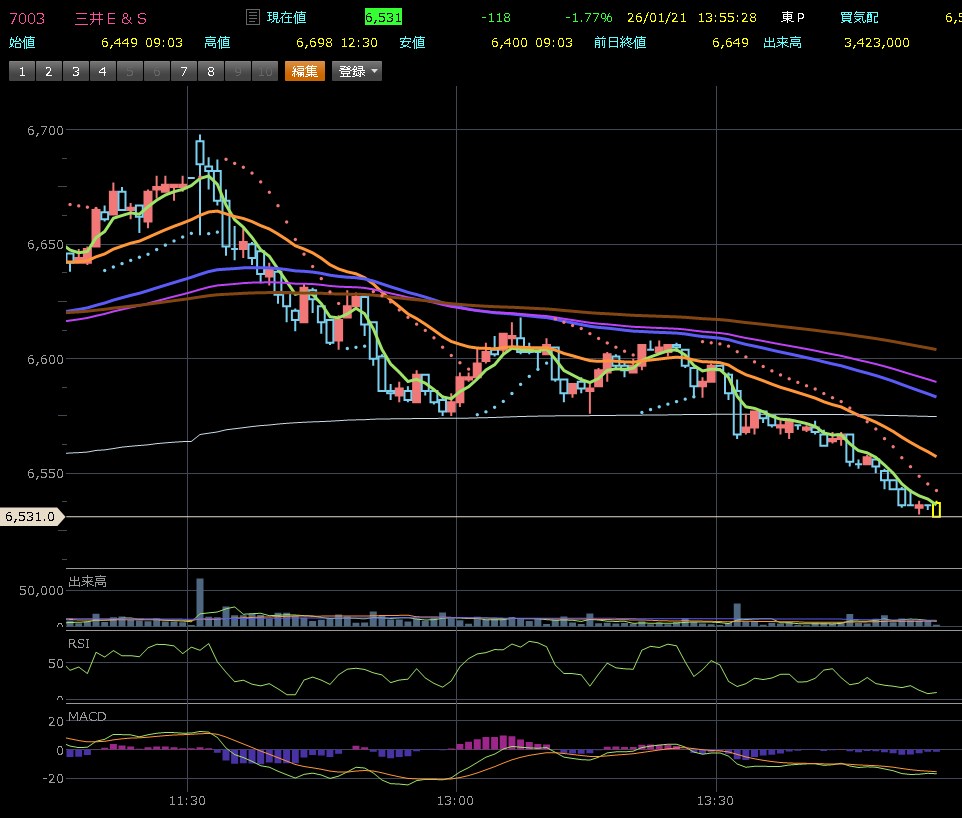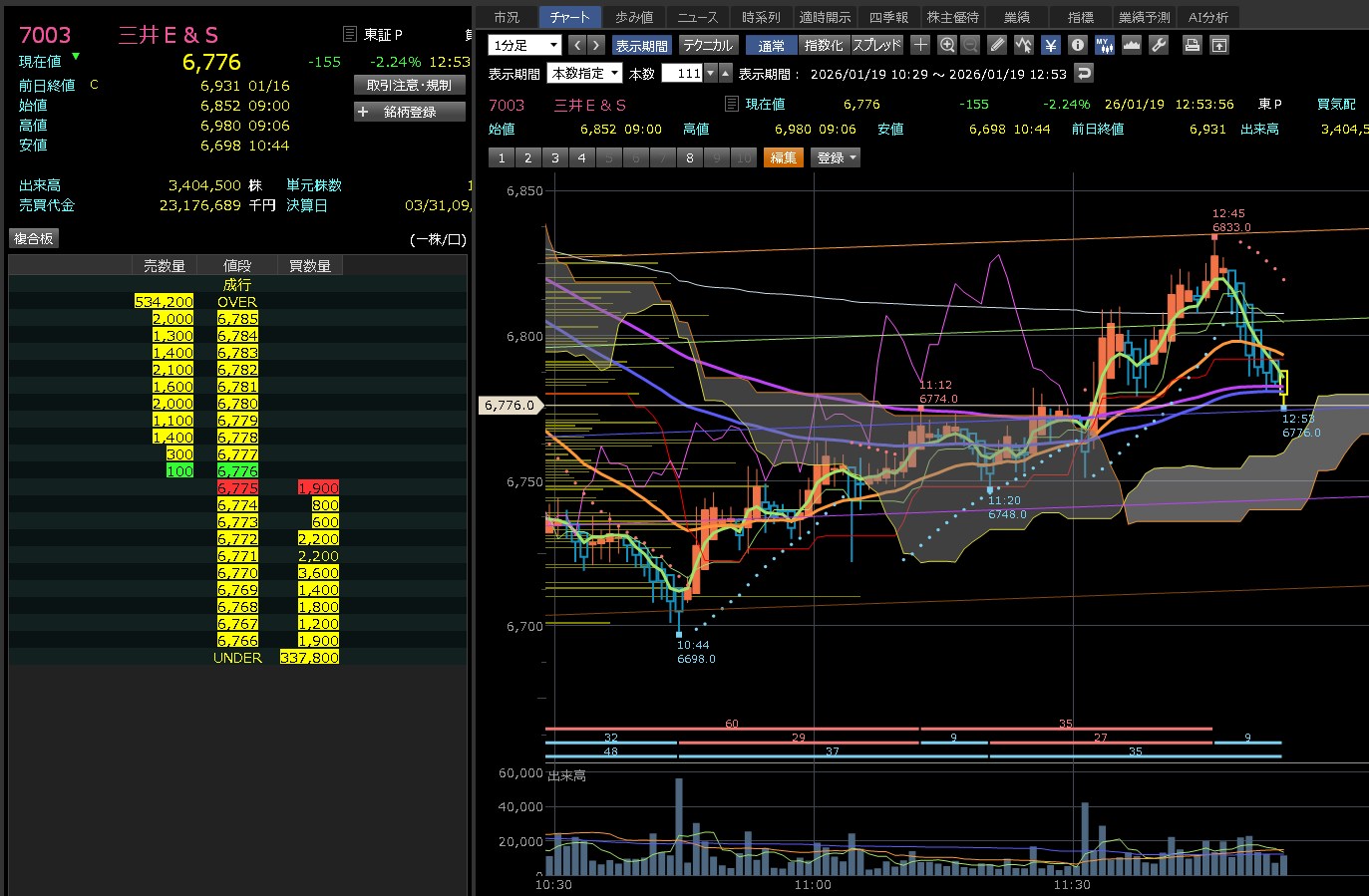 後場がはじまりました。三井ESは落ちるナイフですね。怖い怖い