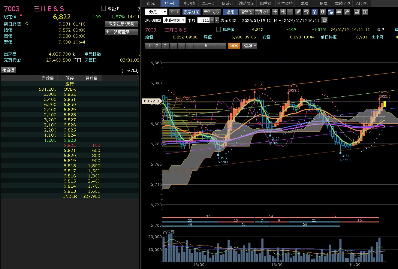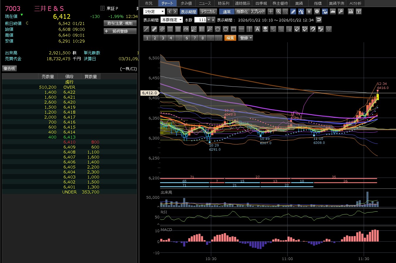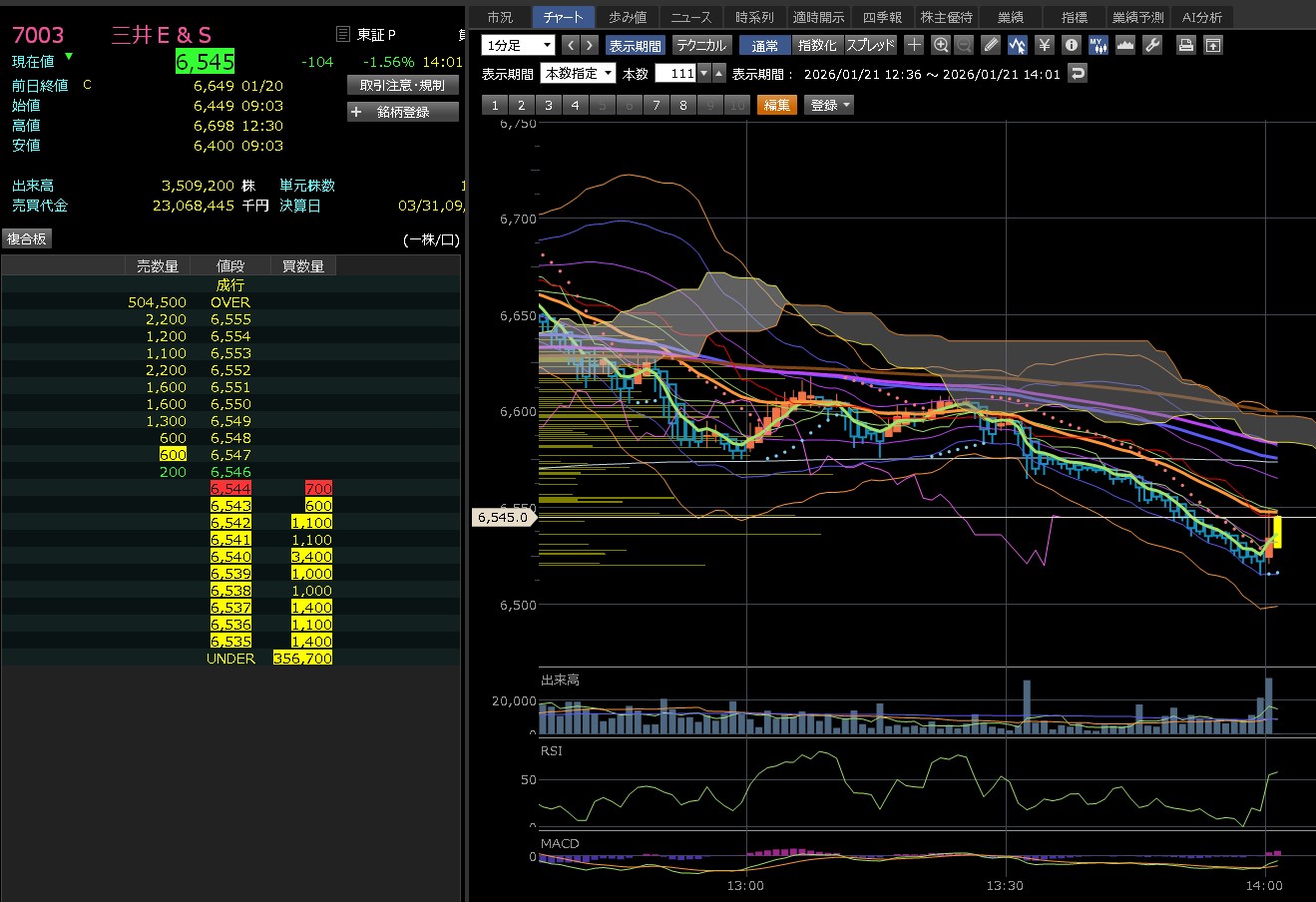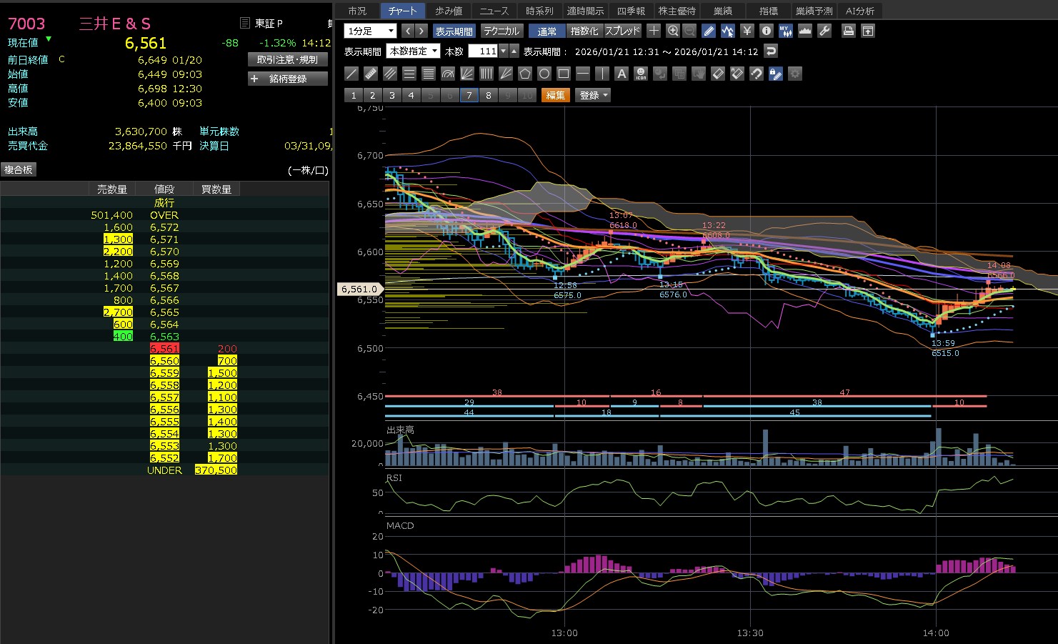 後場がはじまりました。三井ESは落ちるナイフですね。怖い怖い