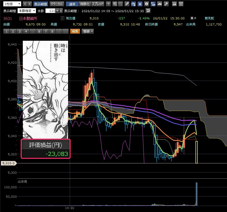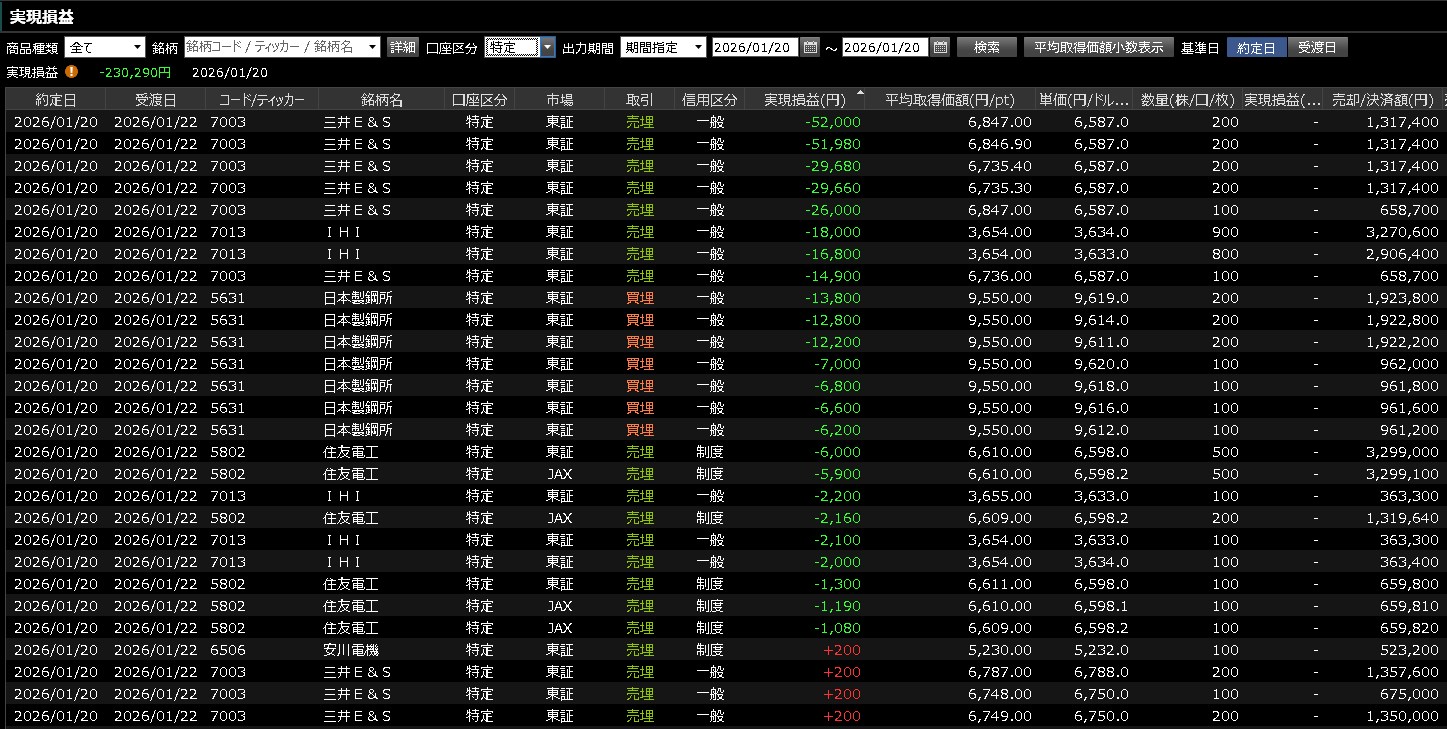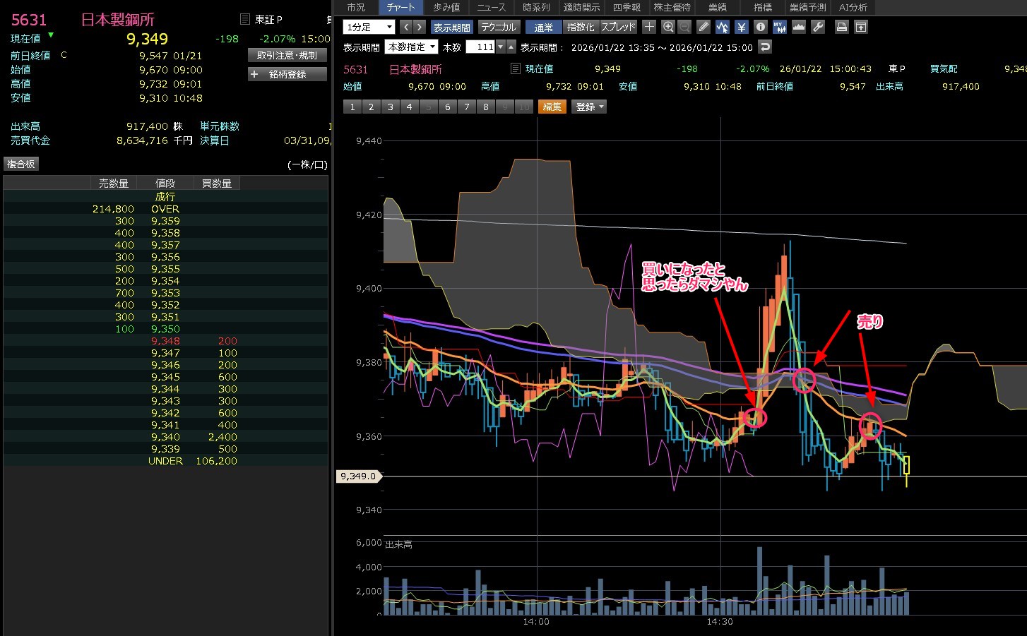 本当に何をやっても駄目でした。IHIを買ったら、ズドンが来る・・・大損や。日本製鋼所は空売りしたら担がれて、もうね・・・本当に何をやっても駄目。悔しいぐらい何をやっても駄目。出かけてる間に下げるんやもん。