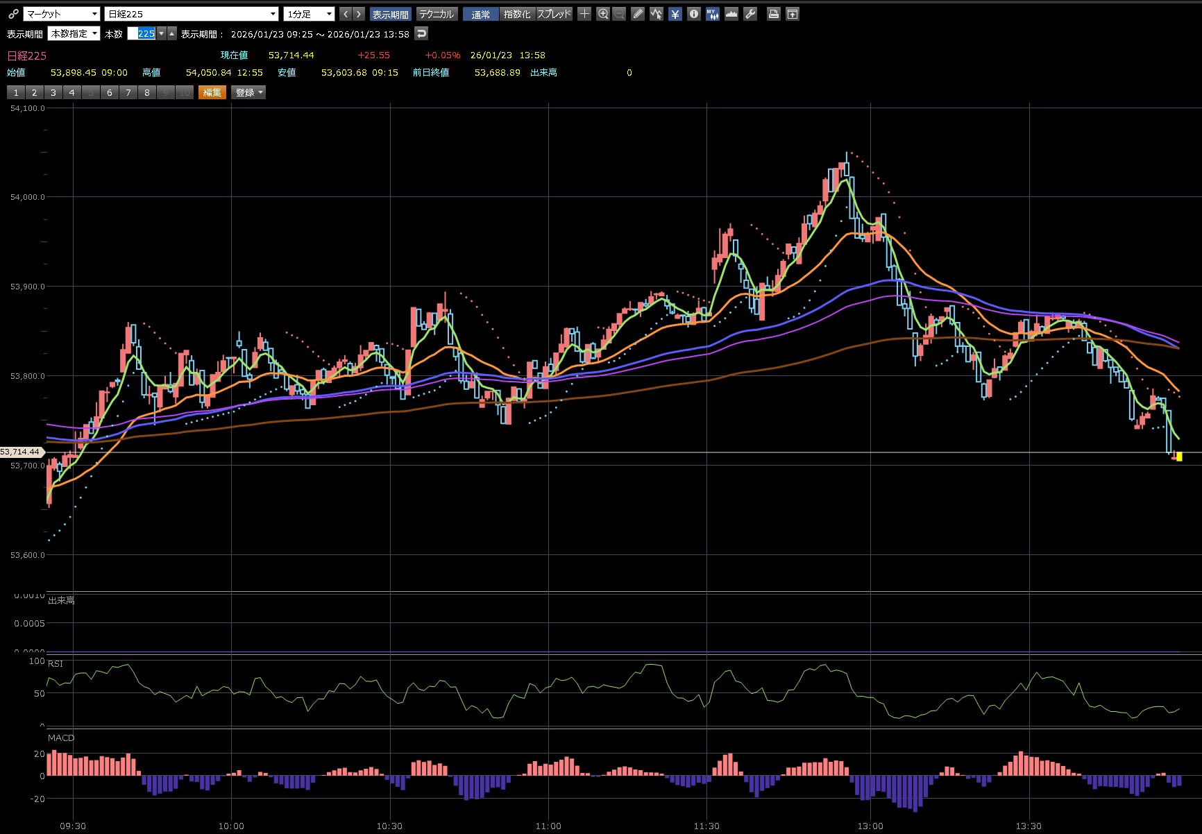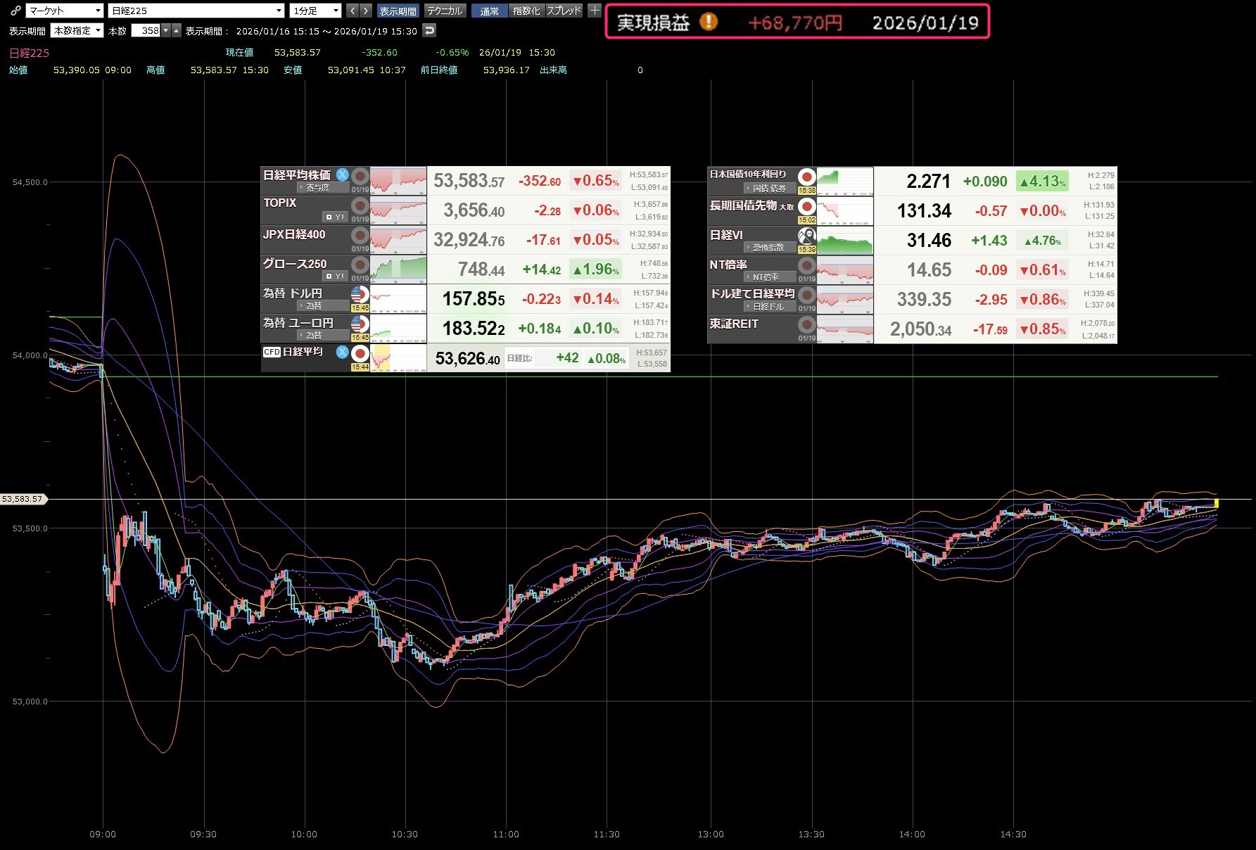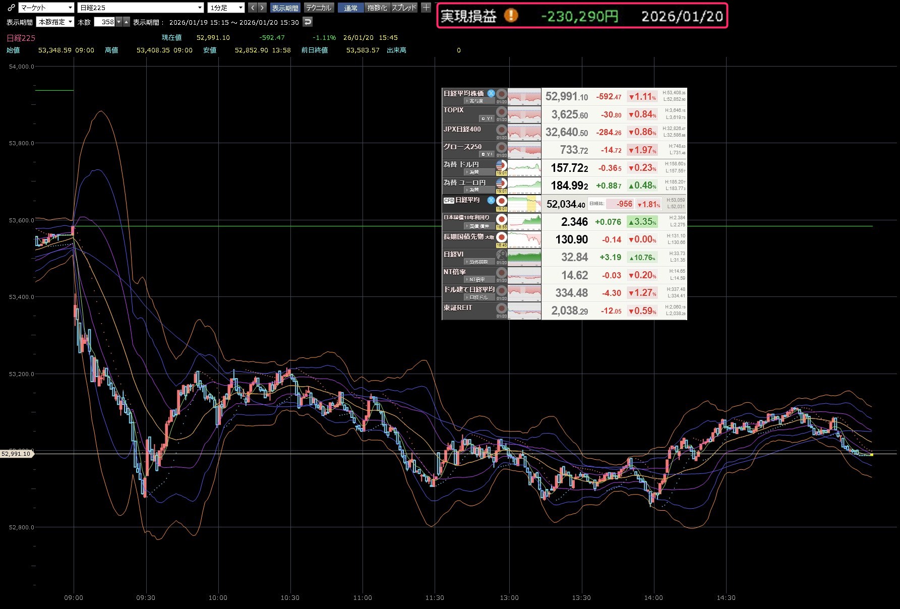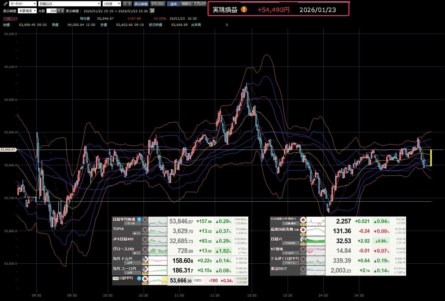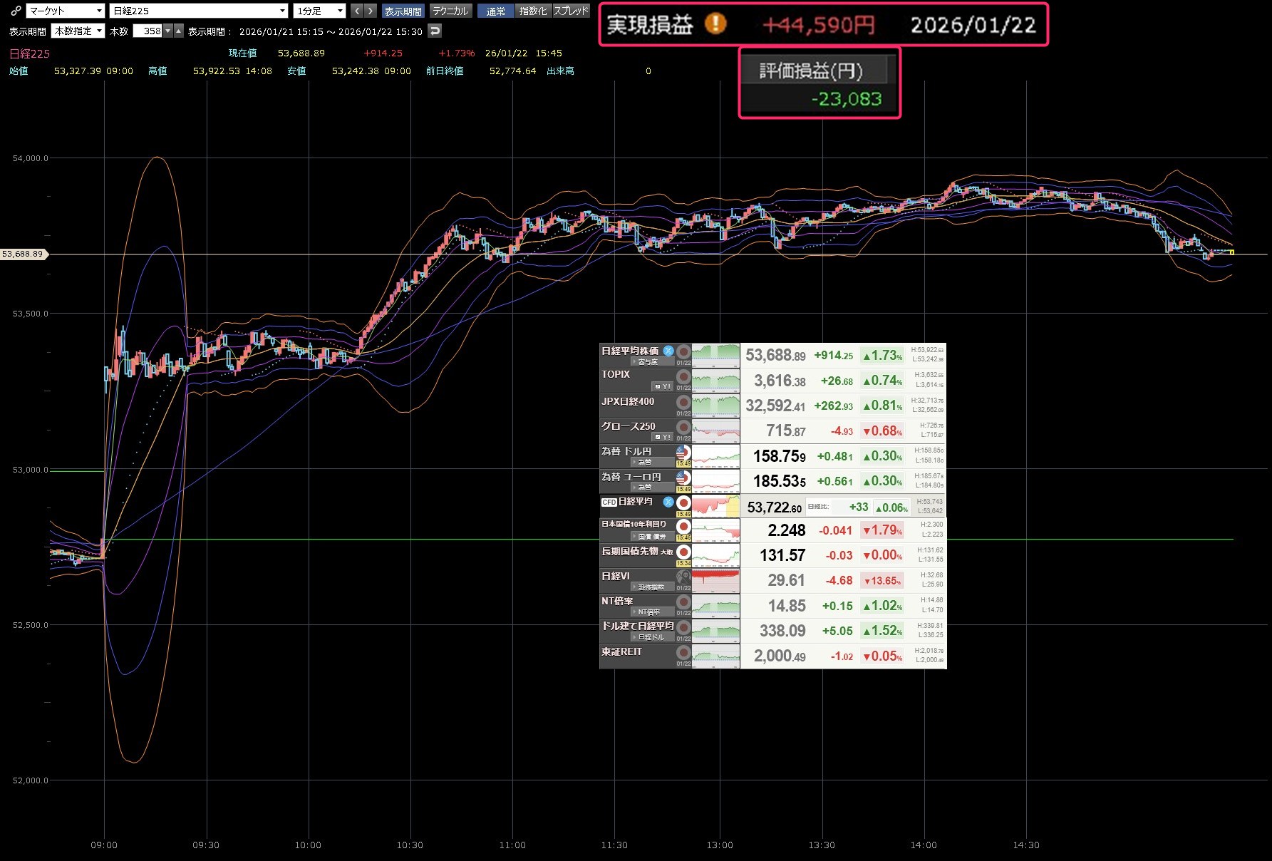 本日のデイトレ結果と日経平均の1分足は以下のとおりです。 なんかさ金利がごっつ上がってるやん。銀行株買いやったんやな。ワイはでも円高になると思ってる。高市さんが大ガチしたらね・・・