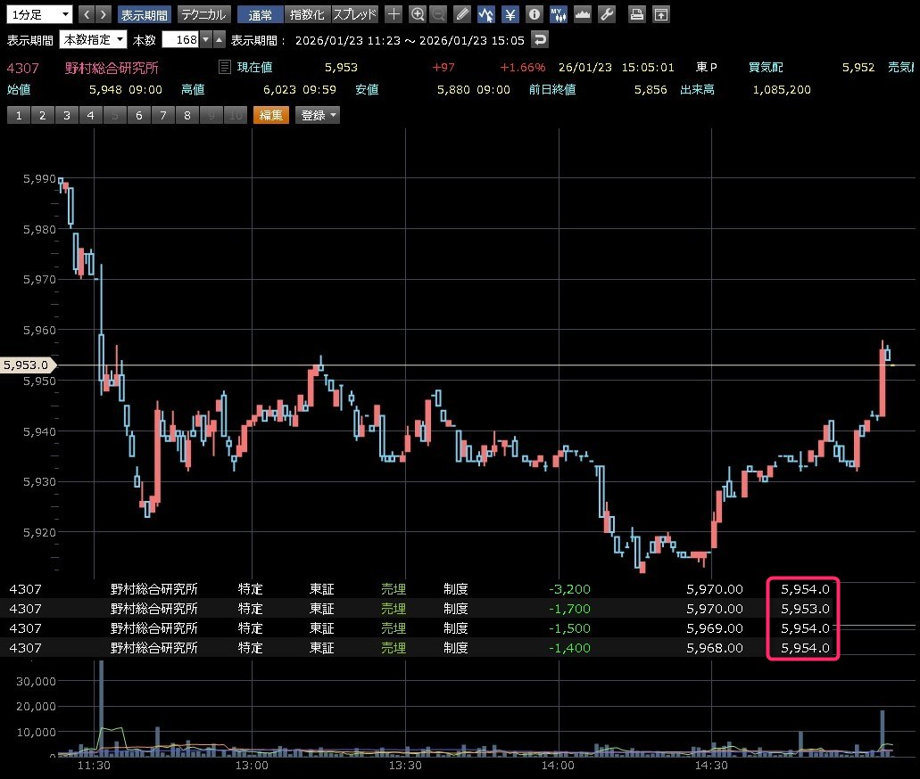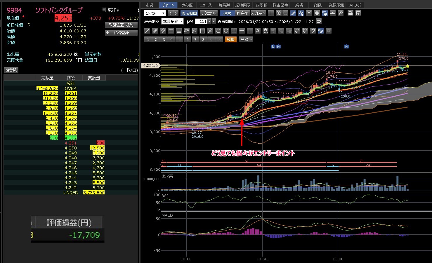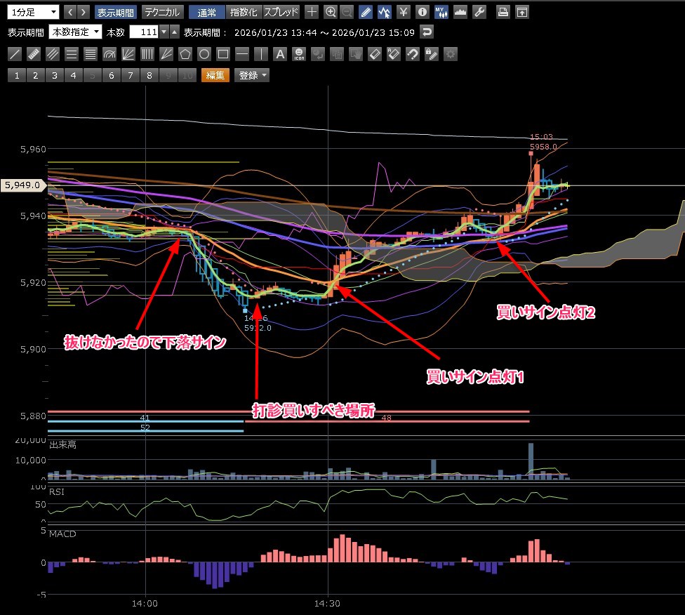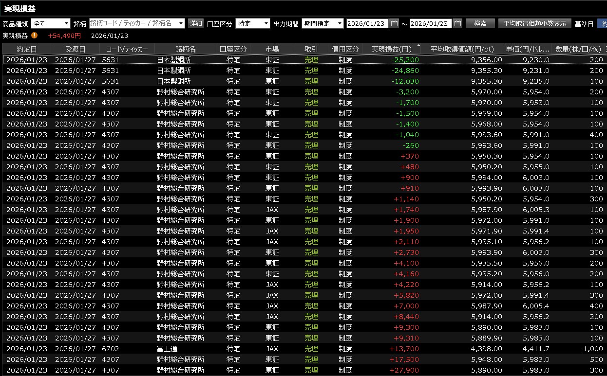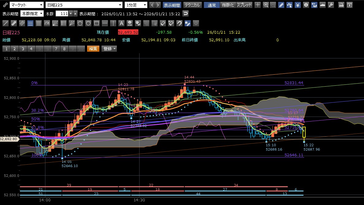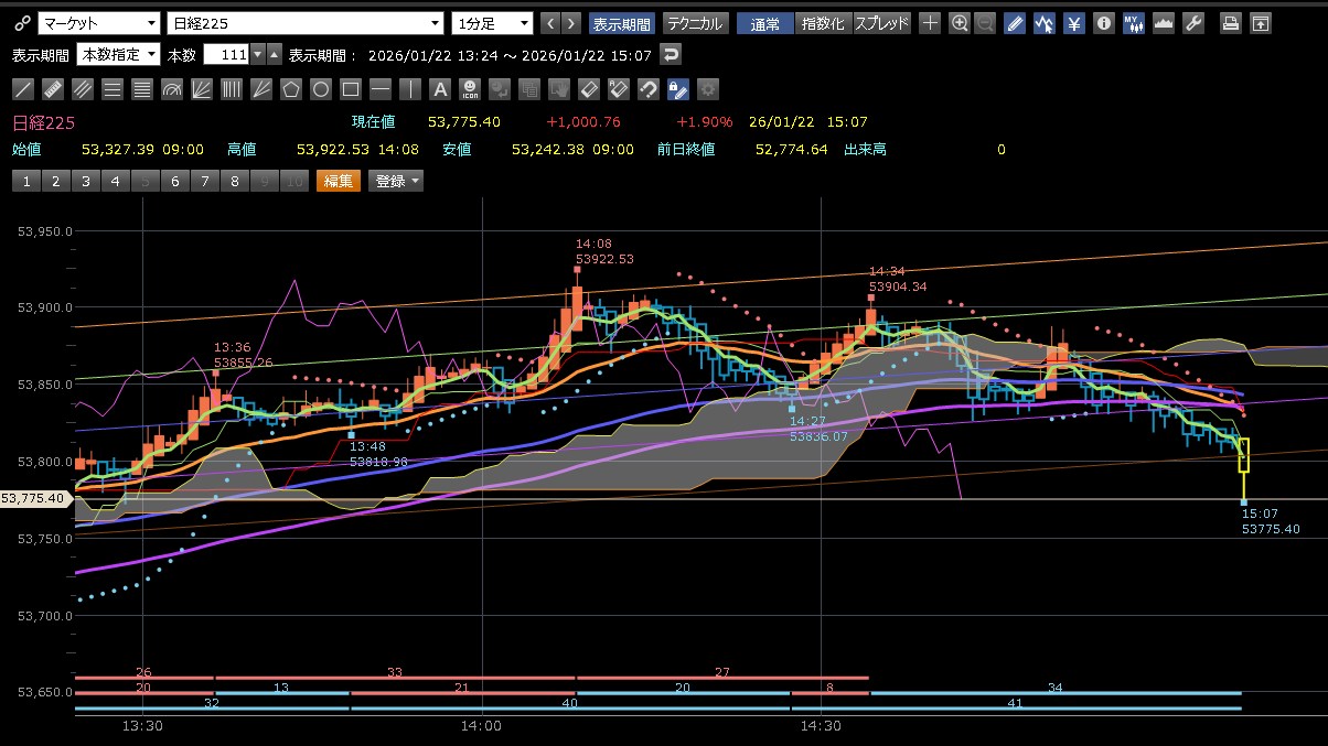 本日のデイトレ結果と日経平均の1分足は以下のとおりです。 なんかさ金利がごっつ上がってるやん。銀行株買いやったんやな。ワイはでも円高になると思ってる。高市さんが大ガチしたらね・・・