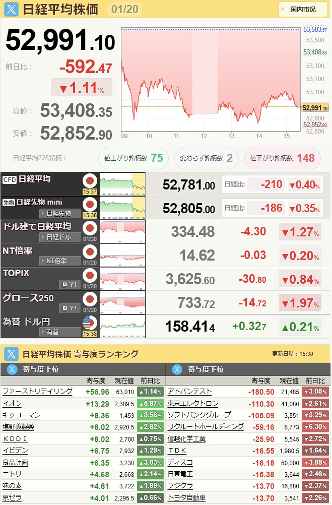 日経平均52,991.1-592.47-1.11%[15:30]米ドル/円158.43+0.36+0.23%[15:30]