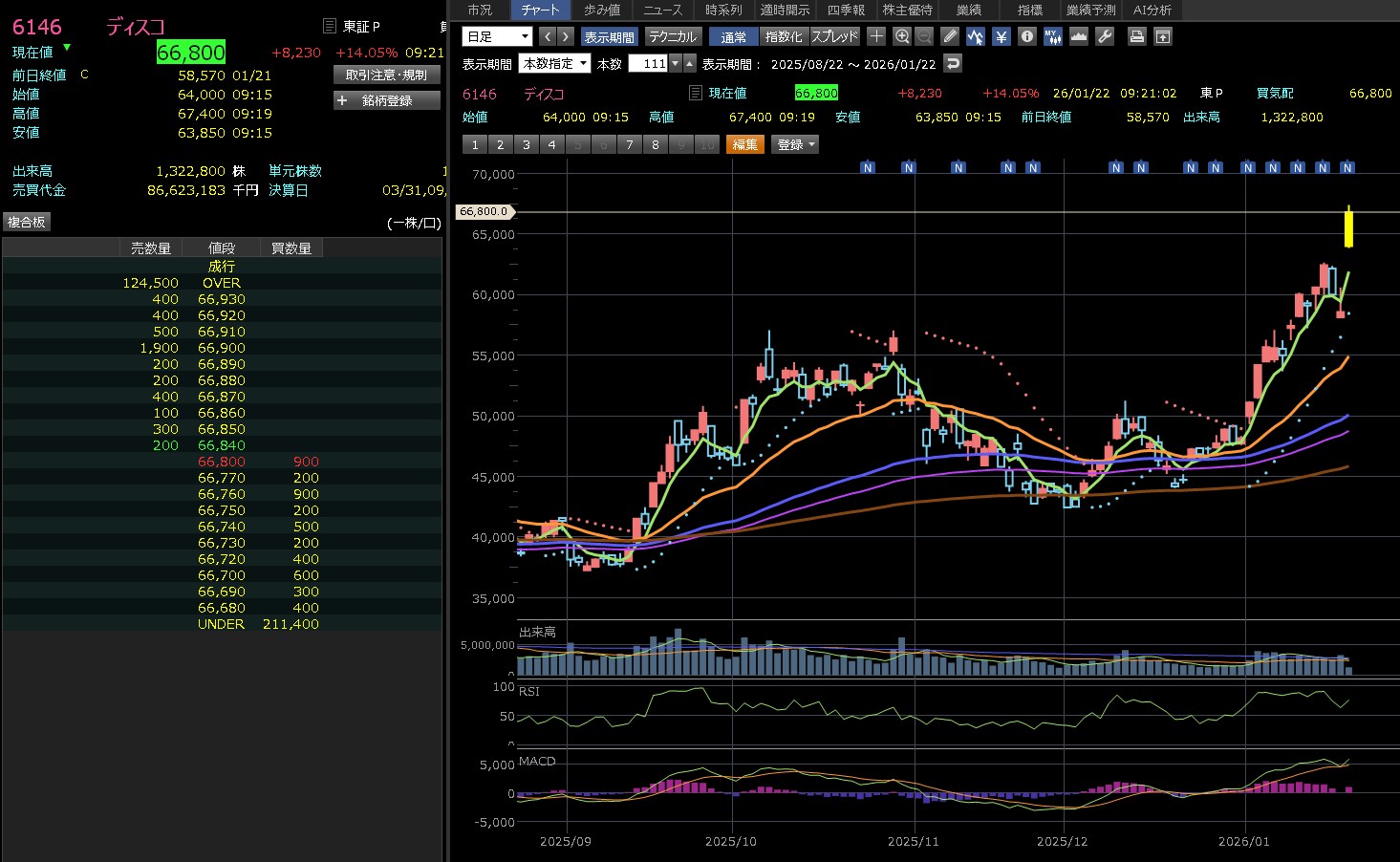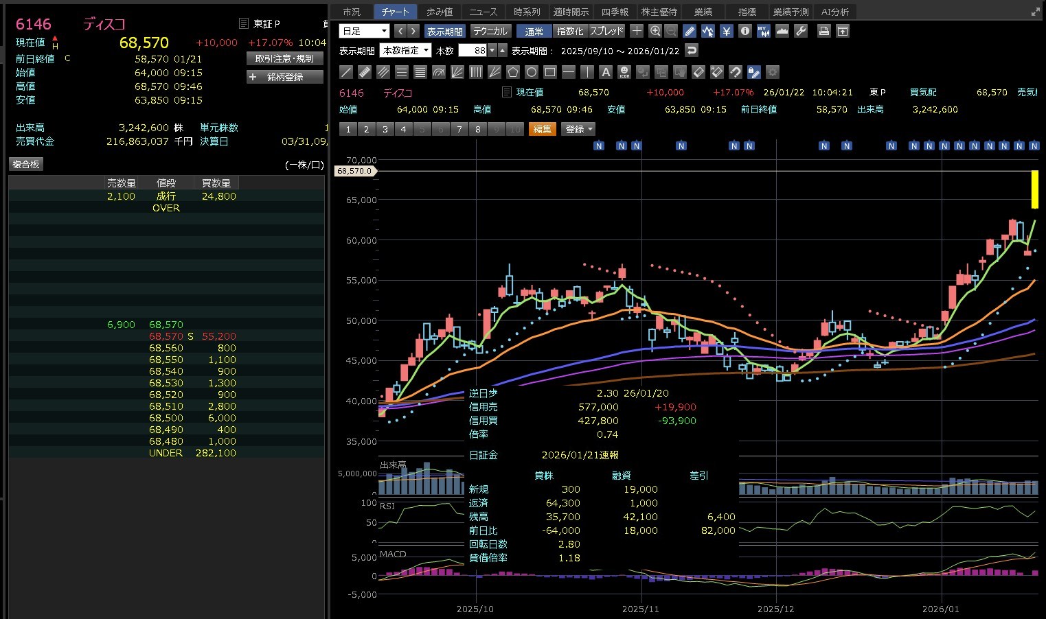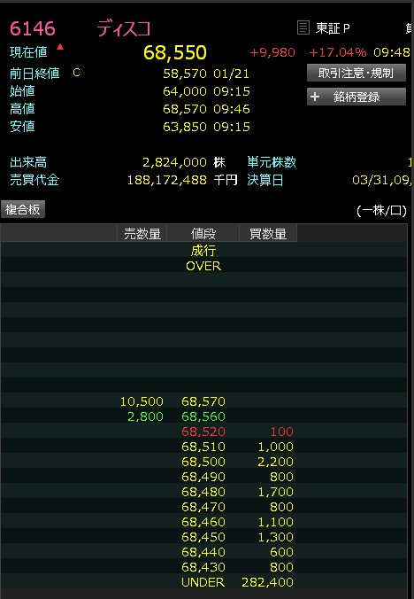 イビデンは振り落としやね。これ・・・そんなに下げてない。いや。下げてるのか・・・知らんけど・・・ちょっとわからんわ。ディスコは流石に昨日のストップ高がおかしかったから、売られるとは思ってた。でもわからんから空売りはようせんけどね。