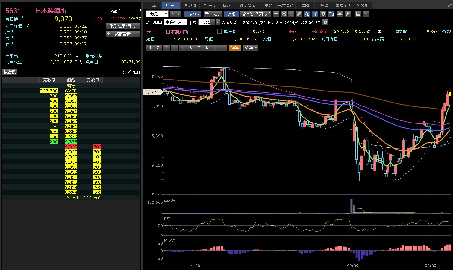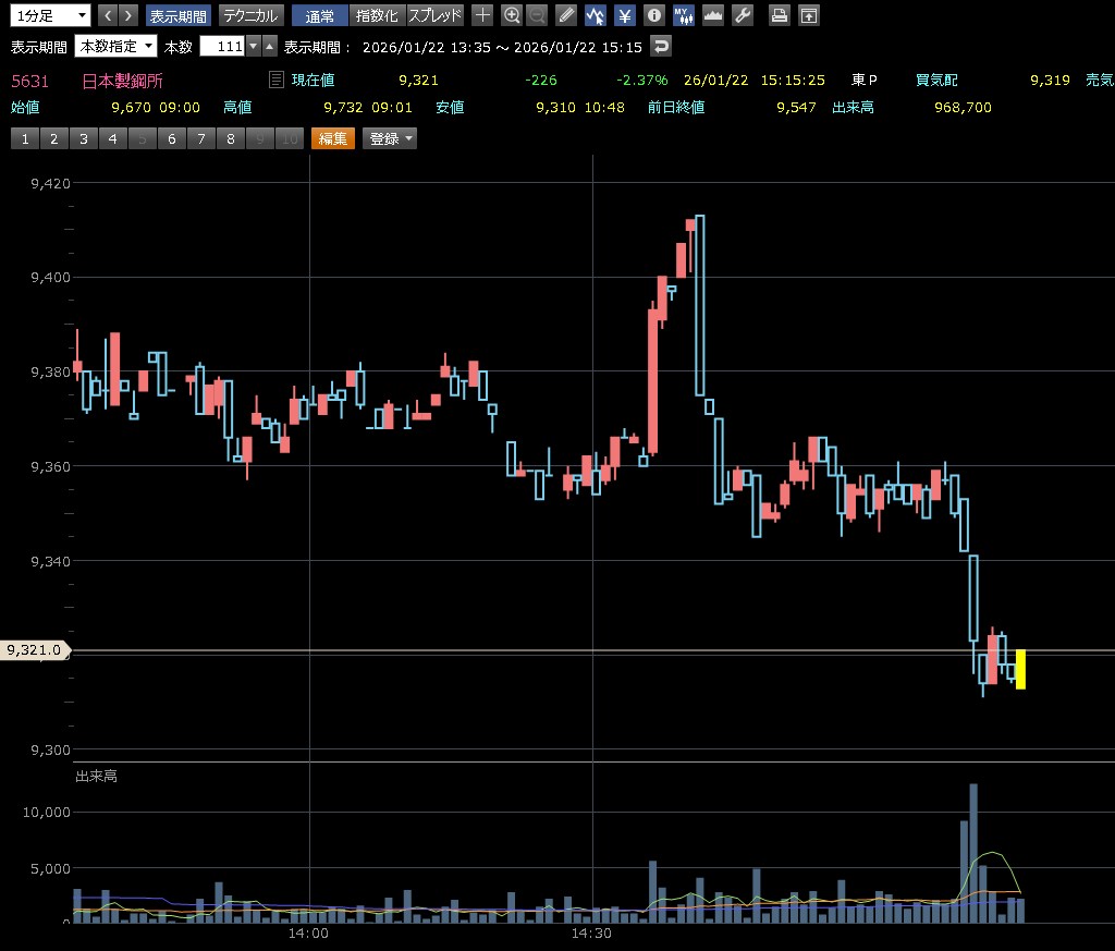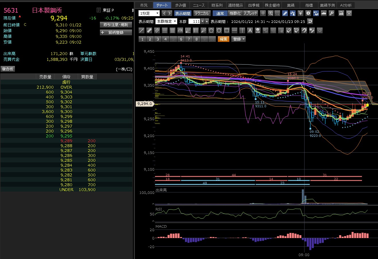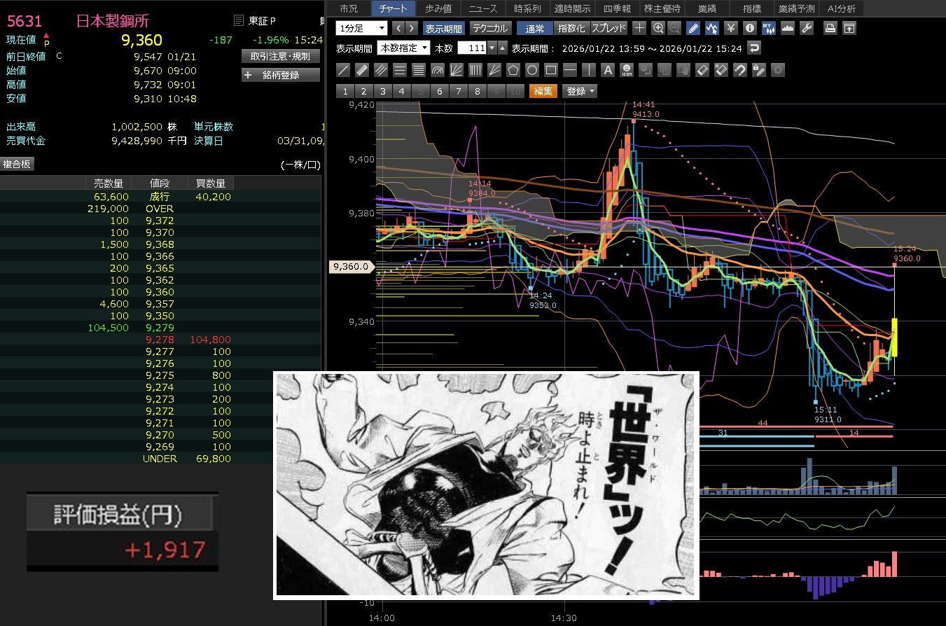 大人しくしておきますか・・・ワイ実は日本製鋼所買ったんや。そしたらぐんぐん下げて、ロスカットしようかと思って買い物に行ったら@9300で売れてた・・・その後、@9400超えたんやで・・・ホンマに悔しいけれど、仕方がない。他の銘柄見ます。住友電工は流石にもう買えない。上げてるからね。プラ転してるし・・・