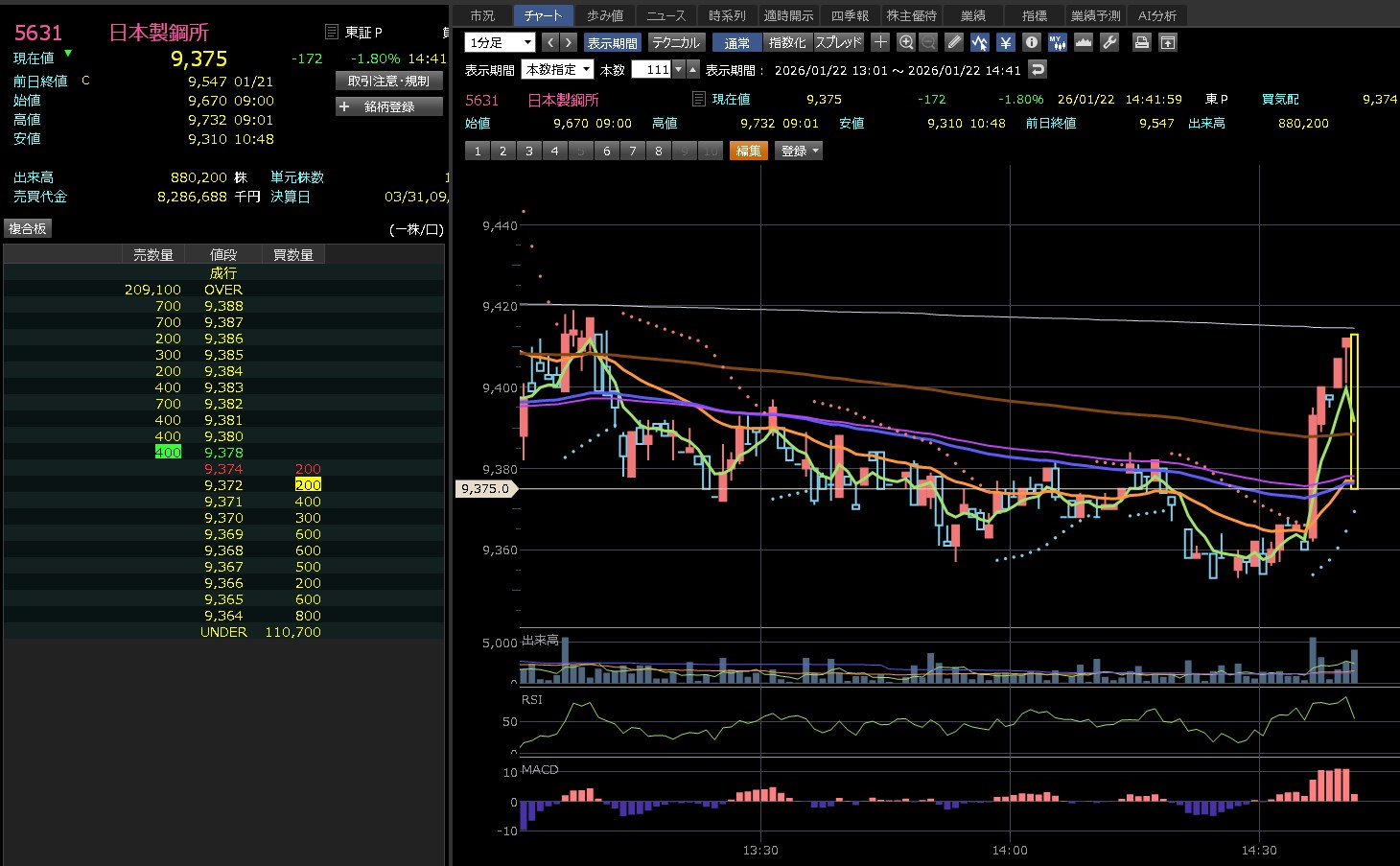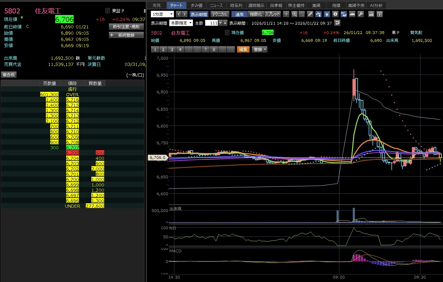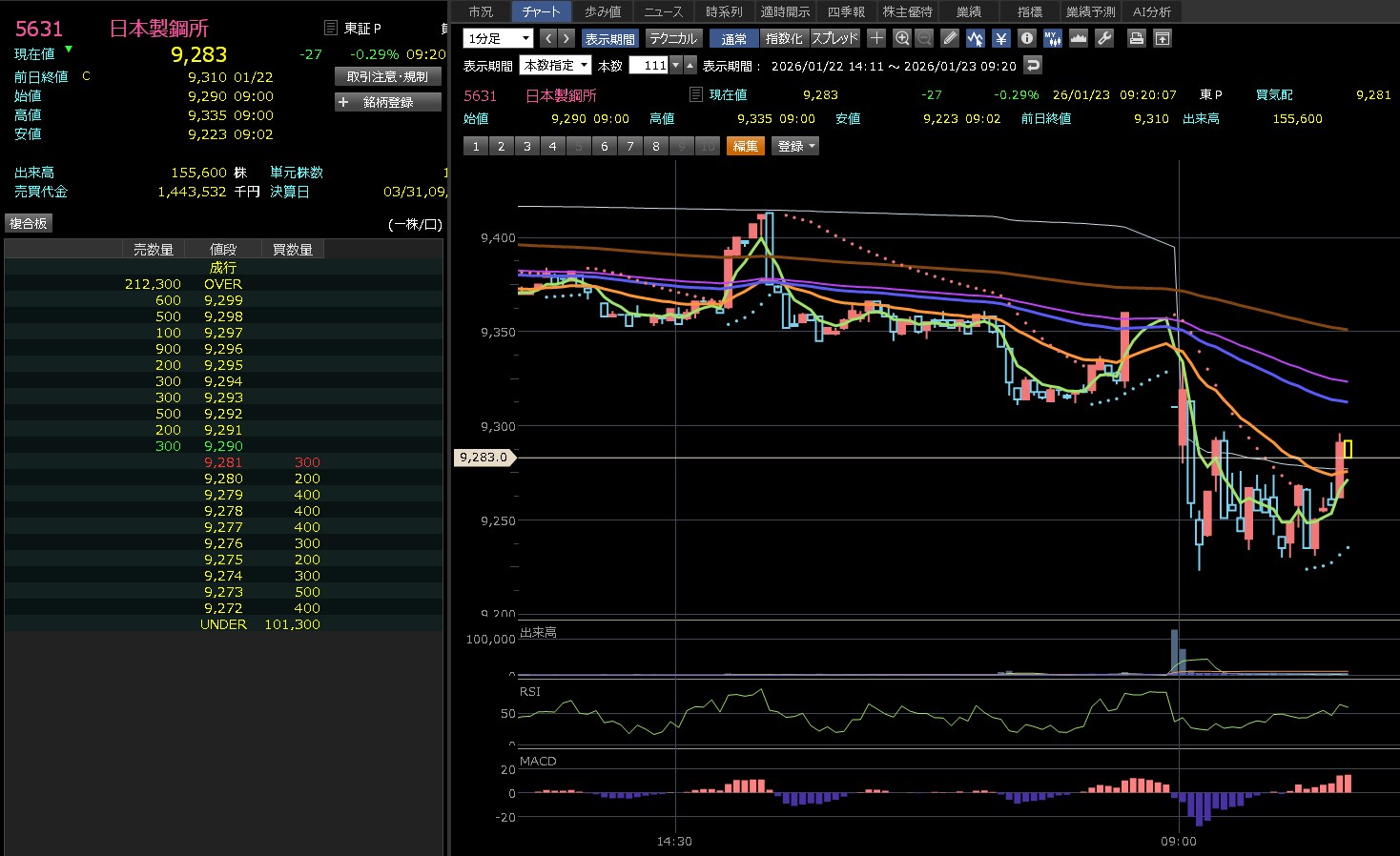 大人しくしておきますか・・・ワイ実は日本製鋼所買ったんや。そしたらぐんぐん下げて、ロスカットしようかと思って買い物に行ったら@9300で売れてた・・・その後、@9400超えたんやで・・・ホンマに悔しいけれど、仕方がない。他の銘柄見ます。住友電工は流石にもう買えない。上げてるからね。プラ転してるし・・・