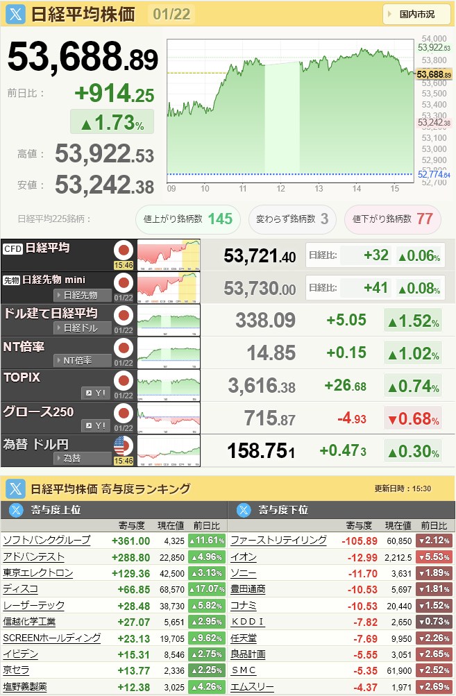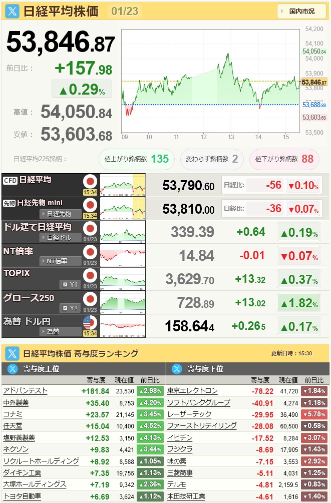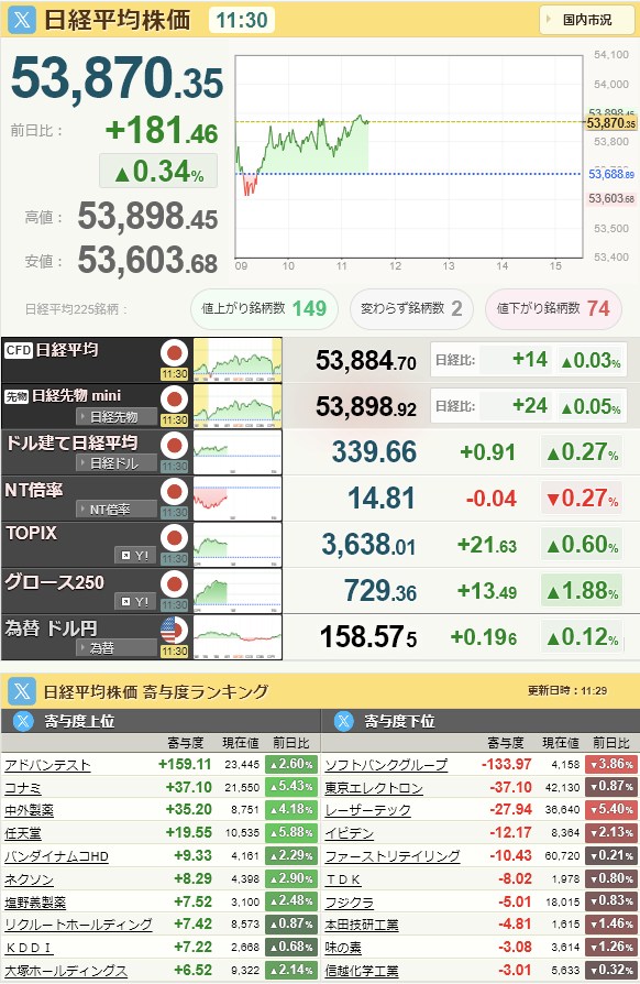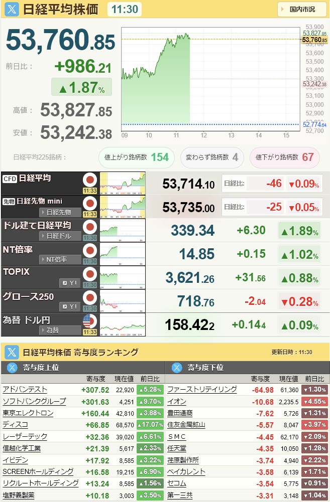 日経平均53,846.87+157.98+0.29%[15:30]米ドル/円158.66+0.26+0.16%[15:29]