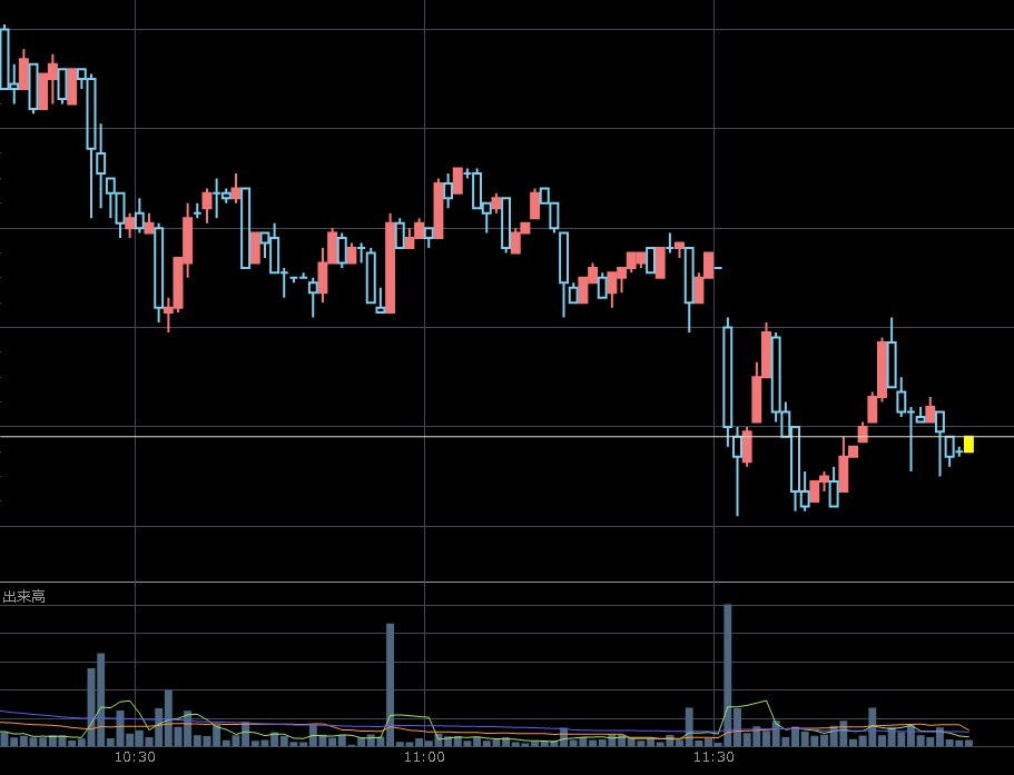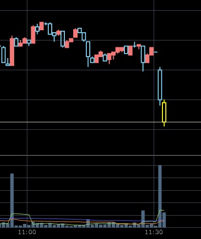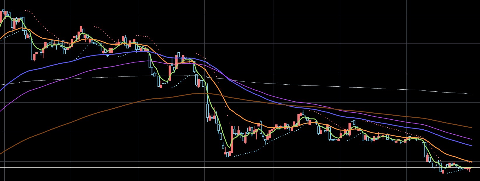 すっと右肩下がりよ。ホンマに後場寄り付きで完全に下降トレンドに入りました。これは辛い辛たんよ。ちなみに1分足です。