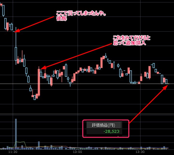 終わった・・・終わってた・・・これはアホですわ。もう持ち越します。ロスカットはしません。あれと同じ匂いがするねん。14:13このあたりが底だと思うのですけどね。含み損がガンガン増えていくわ。もうこれ以上は追加購入は無いです。ナンピンは負けですからね。ホンマに寄り付きで買うんじゃなかったよ。bye bye ヾ(;ω;) bye bye