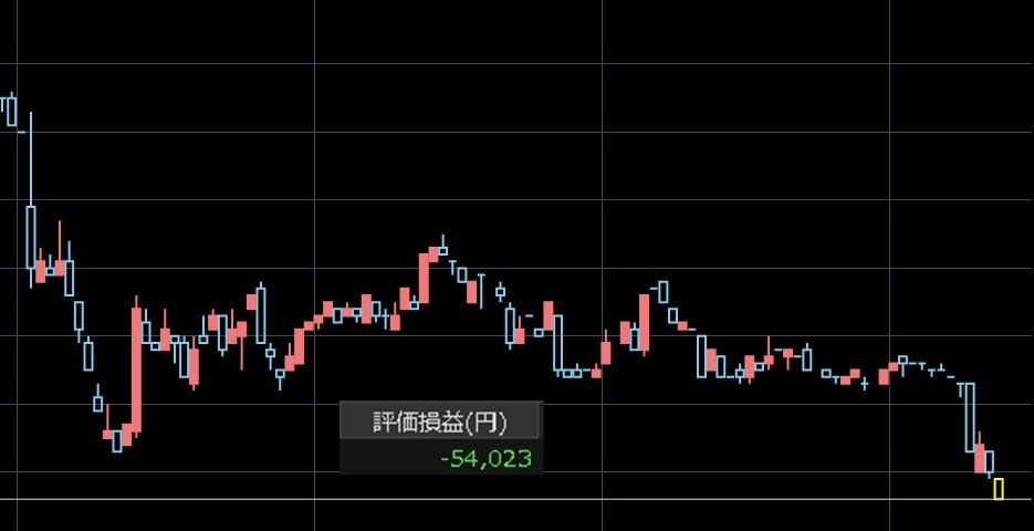 ちょっと持ち越すと逆を行く。また損したわ・・・6万円以上ってふざけんなよ。やっぱ持ち越すとクソ株ですわ。高値つけて陰線つけるような株はアカンね。これ・・・いい加減学習しないと・・・