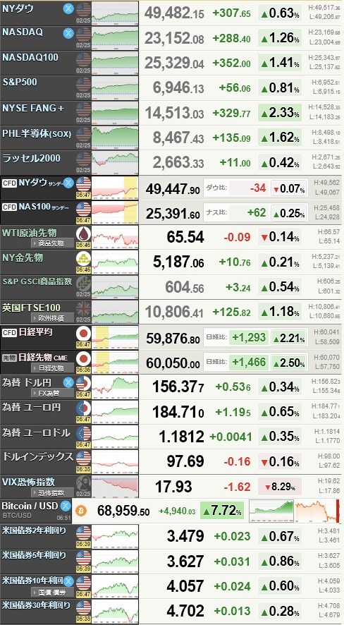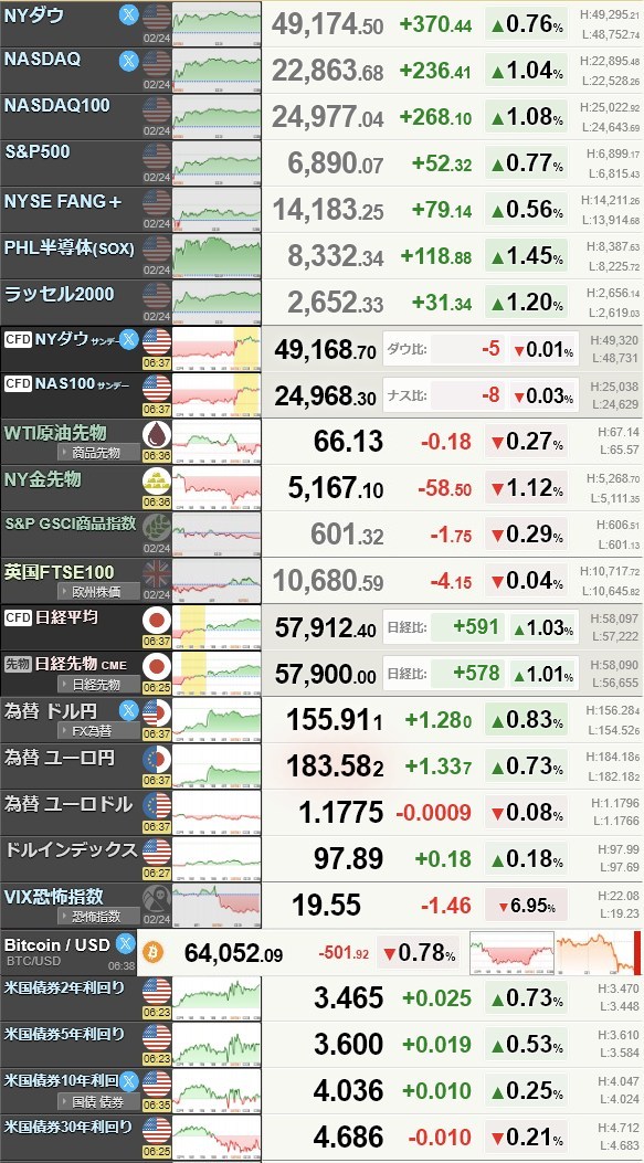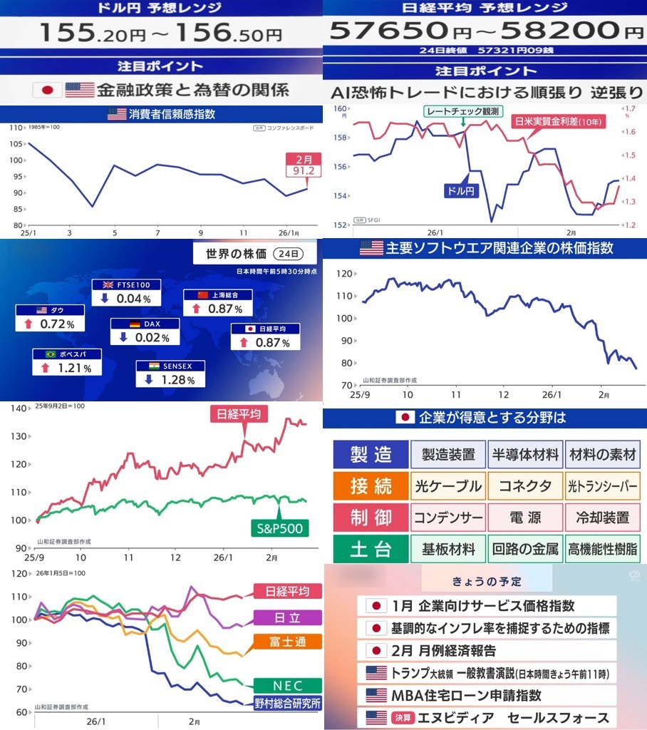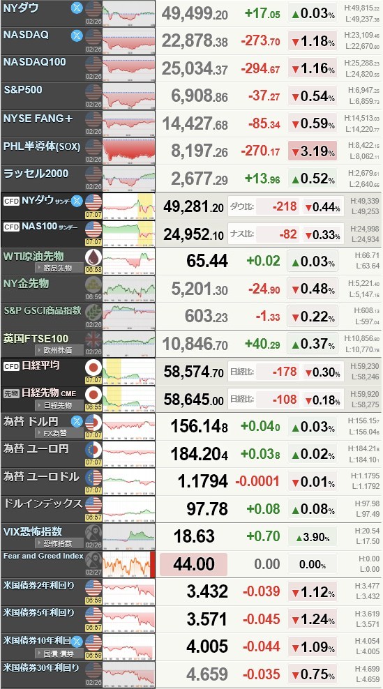 アンソロピックの影響でアメリカ市場が弱すぎるんだが・・・って思いながら、昨日の米市場の結果と本日のレンジ・予定は以下のとおりです。