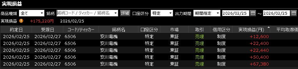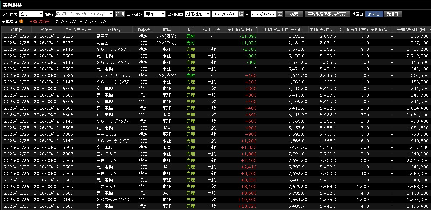 ノーポジなのでゆっくり休みますよ。乙でした。ただ安川はもったいないことをしました。@5544までは持ってることは無いけれど、もう少し・・・せめて前場我慢できれば+60万はいったはずやん。いろいろ学ぶで乙でした。明日も相場を楽しみます。今月はこれで終了ですね。明日から3月取引ですね。やはり下鴨神社に行ってたときの鹿島の損失が痛かったな。乙でした。