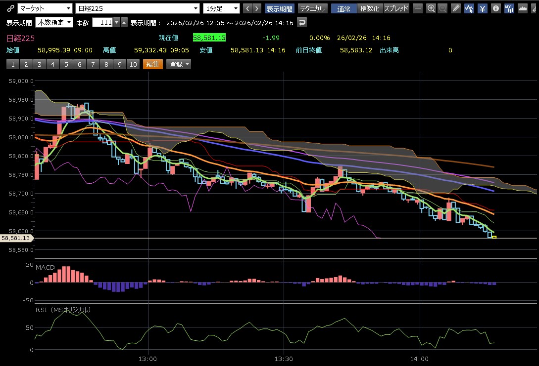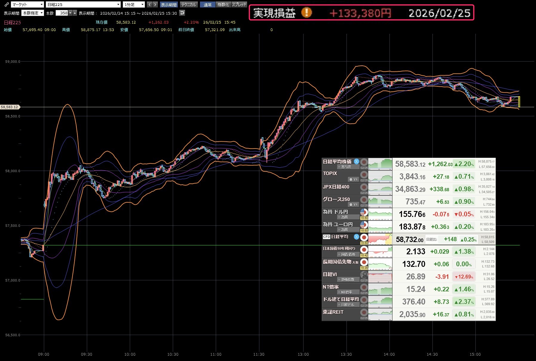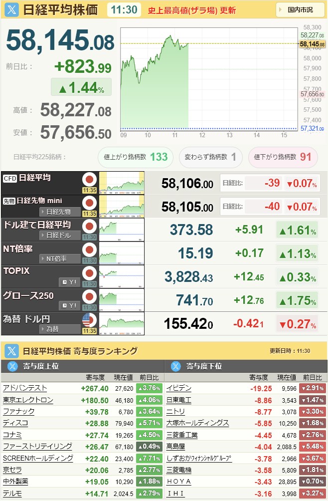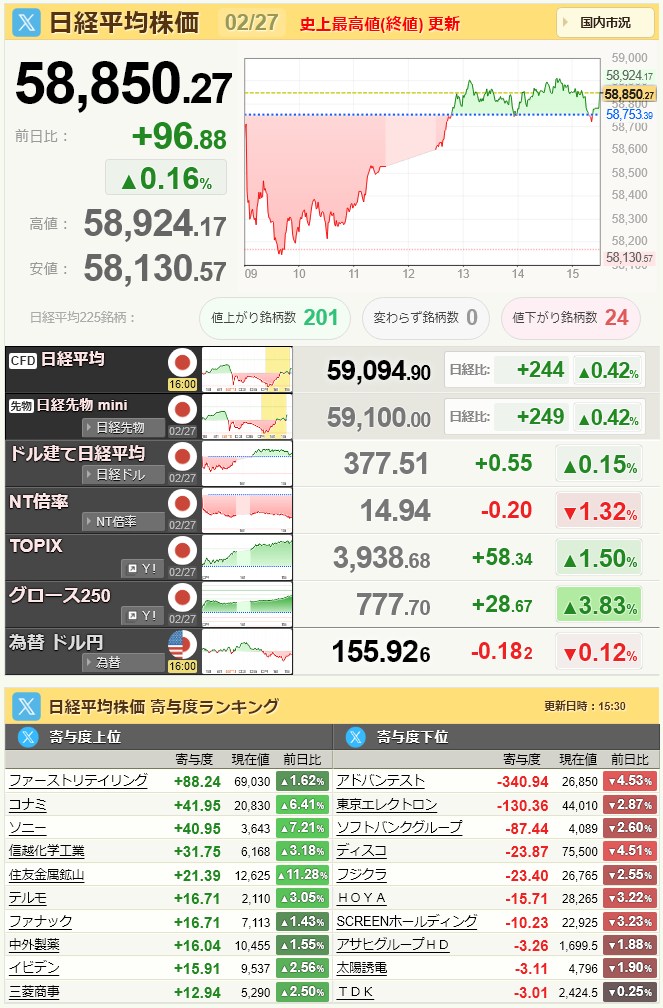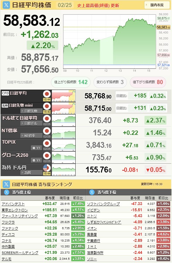 日経平均58,583.12+1,262.03+2.2%[15:45]米ドル/円155.68-0.13-0.08%[15:39]