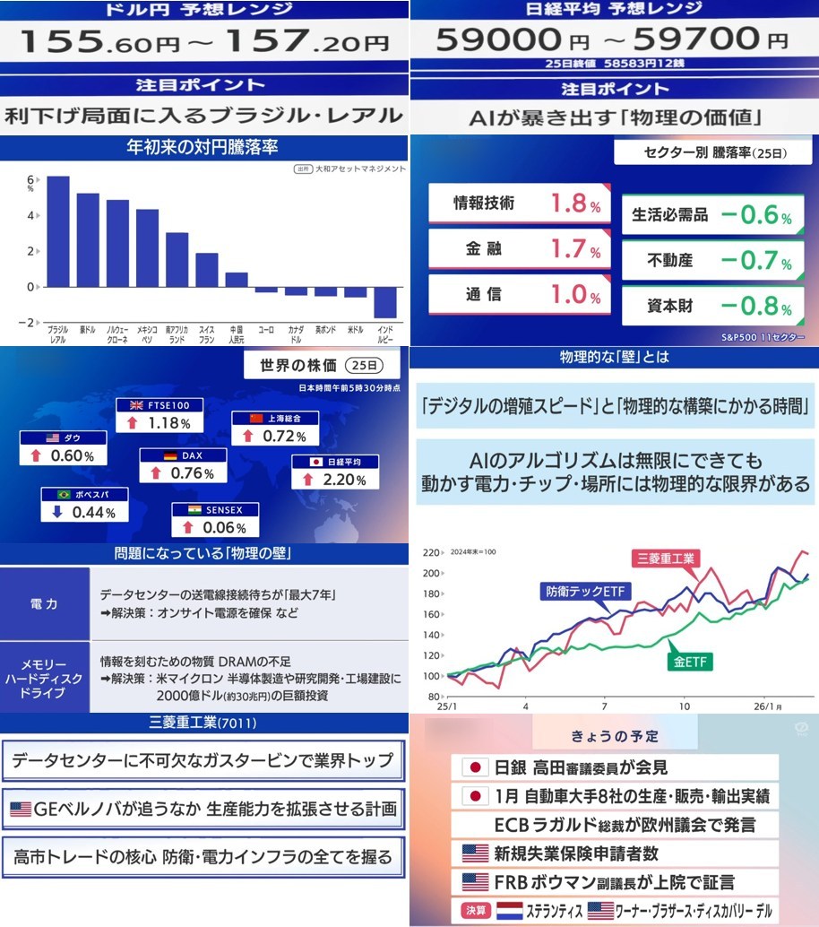 影響: これまで相場を牽引してきたAI・半導体関連株への過熱感が改めて意識されており、本日の東京市場でも**東京エレクトロン (8035)やアドバンテスト (6857)**などのハイテク・半導体主力株への逆風となる可能性があります。また、2026年の世界スマートフォン市場の縮小見通し(検索結果1.1)も、関連する電子部品株の重荷です。