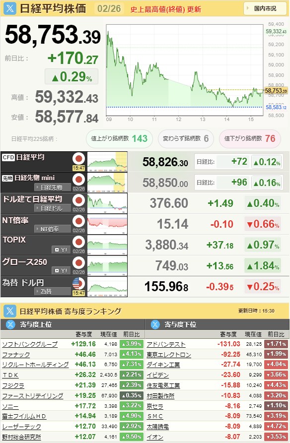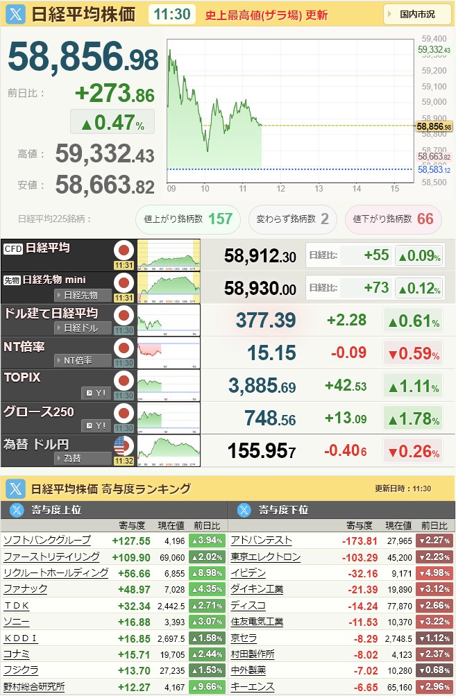 日経平均58,753.39+170.27+0.29%[15:30]米ドル/円156.06-0.27-0.17%[15:30]