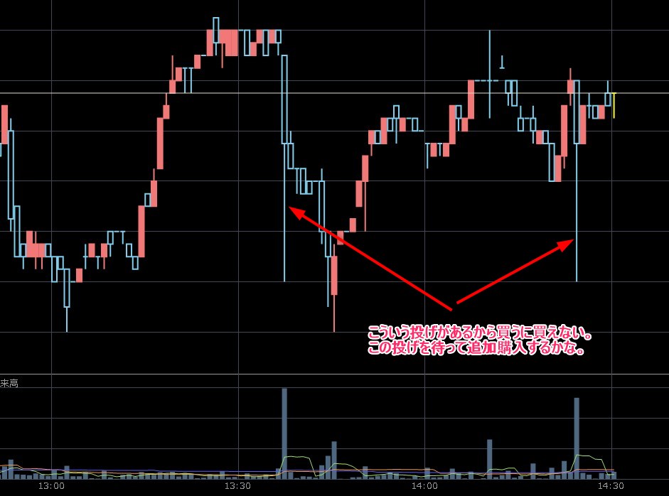 投げたやつまじで心臓に悪いねん。何してくれてんの?追加購入して平均買い単価を下げるのも作戦やったな。戻してきたわ。含み損のままやけど なんかいやらしいわ。ワイの買値から含み損のところで動かないねん。13:25 この下げの逆来いよ。ってまた下げてきた。